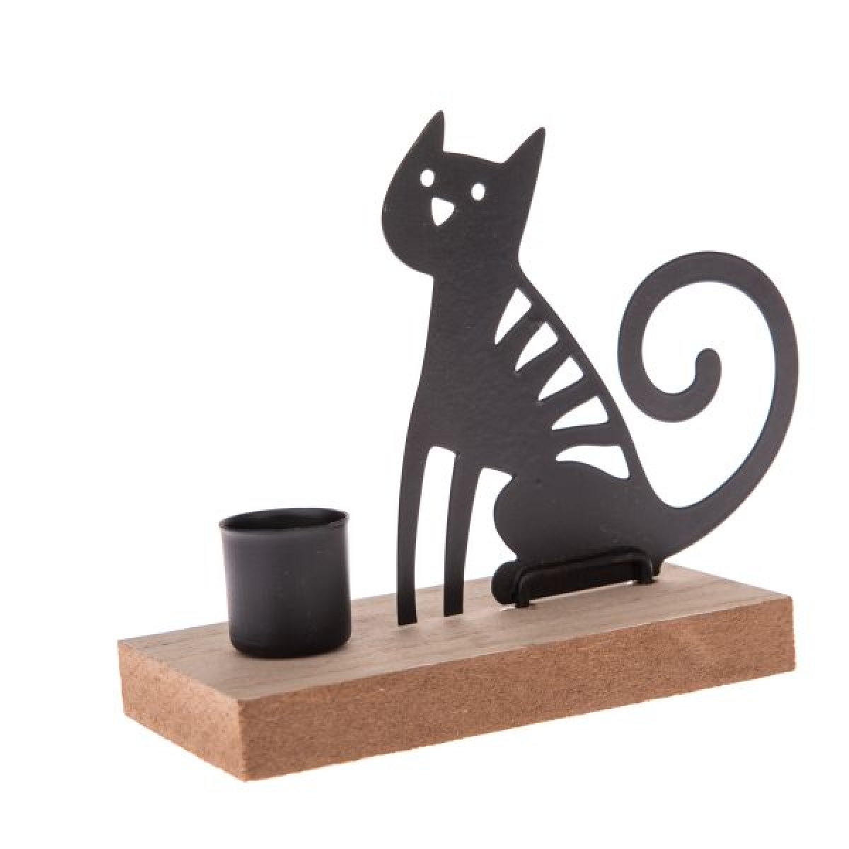 Kovový svícen tvoří dřevěná podesta ve tvaru obdelníku a kovovu postavou kočky, která střeží plamínek svíčky.
