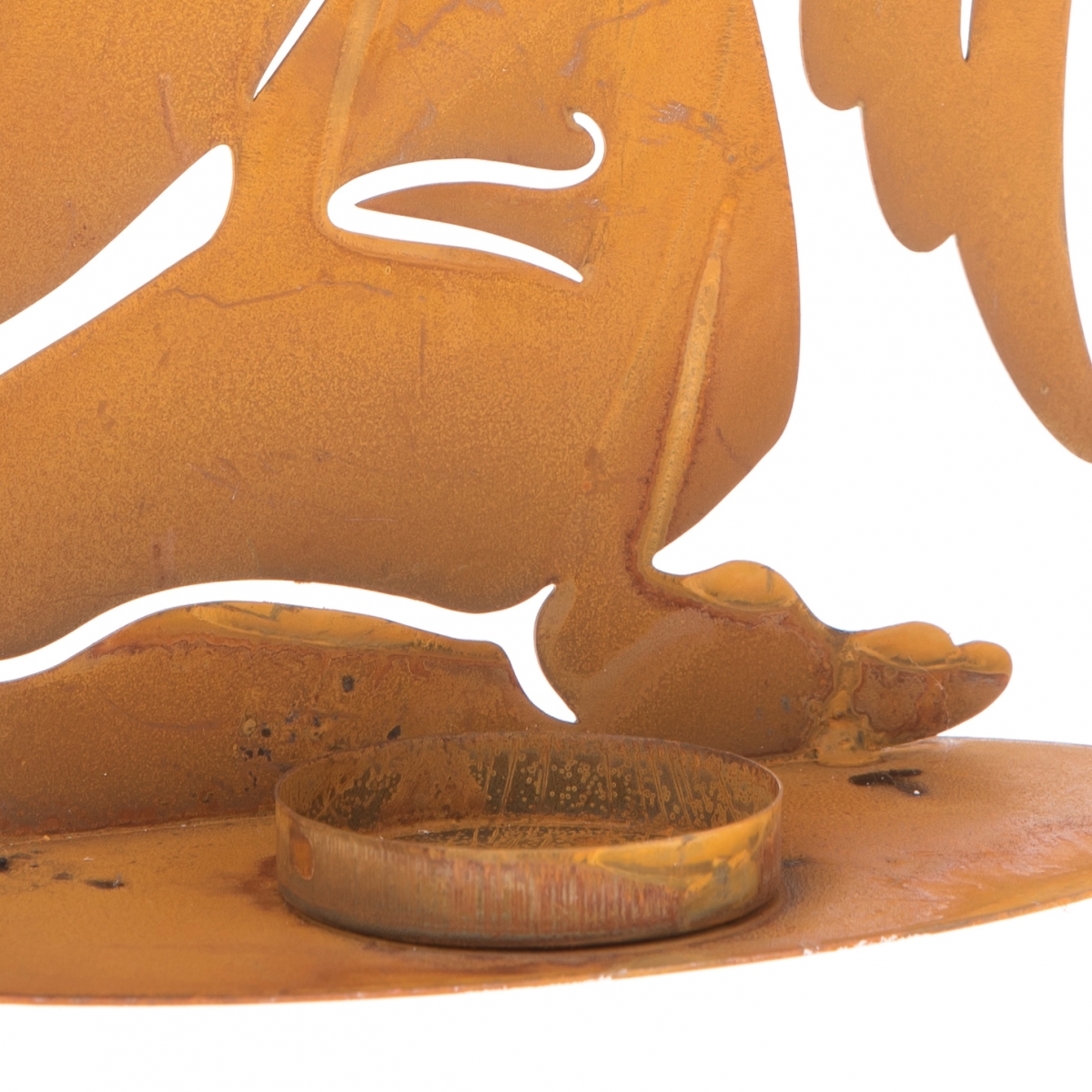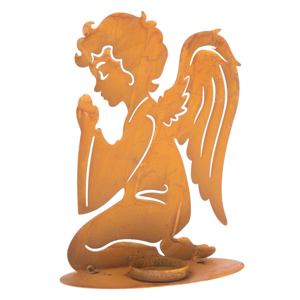 Kovový svícen umístěte na okraj krbu, krbovou římsu, nebo na parapet. Vedle kovové sošky modlícího se andělíčka, je prostor s okrajem pro uložení čajové svíčky.