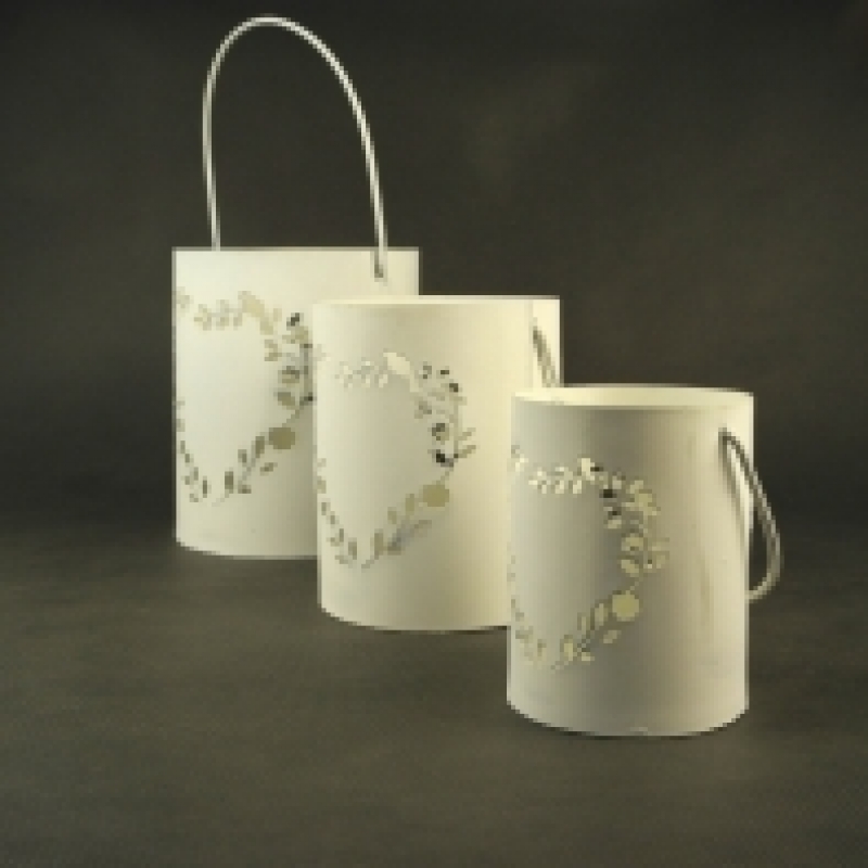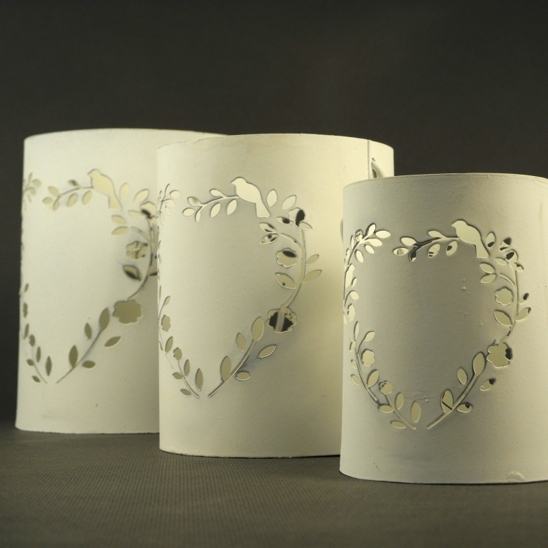 Svícen je kovový v krémové barvě, perforovanými obrazci prosvítá světlo svíčky do okolí.