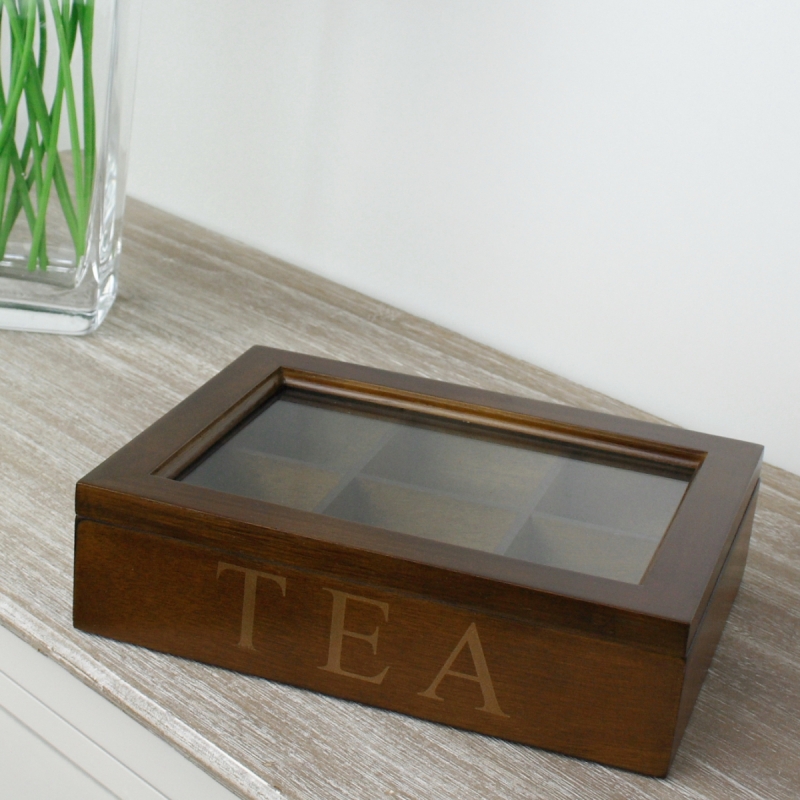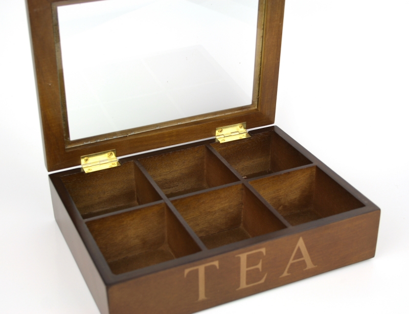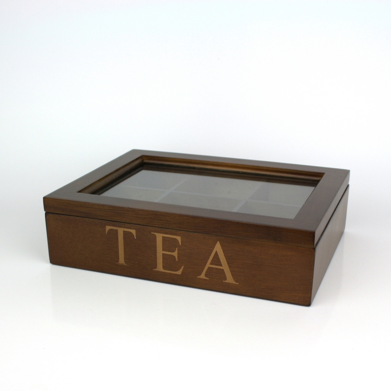 Dřevěná krabička má prosklené víko a na přední straně zlatý nápis TEA.