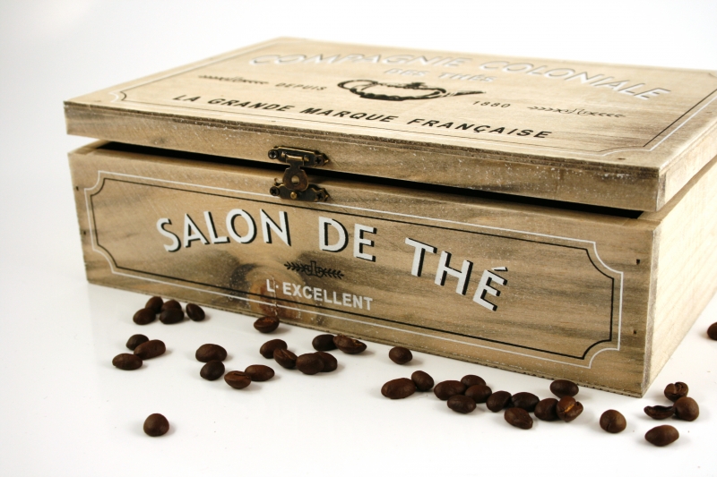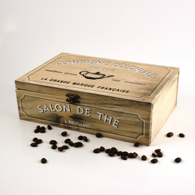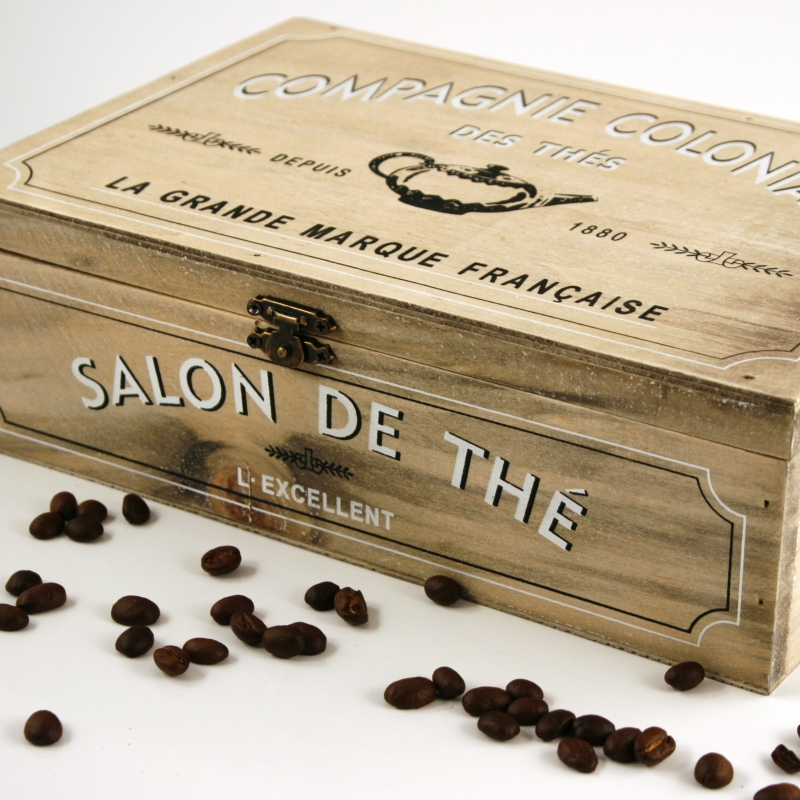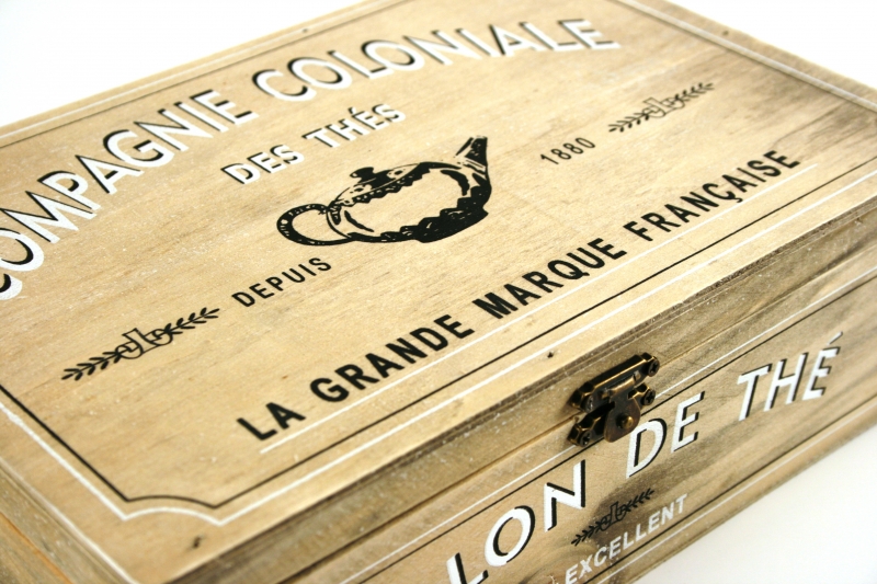 Krabička na čaj Compagnie Coloniale má rozměr 26 x 17 x 8 cm. Je vyrobená ze dřeva, víko uzavřete ozdobným kovovým zavíráním. Celou krabičku zdobí černé a bílé nápisy. I z nich je jednoduché vyčíst, že krabička slouží hlavně k uskladnění čajových sáčků. Ovšem její obsah záleží samozřejmě jen na vás.