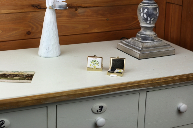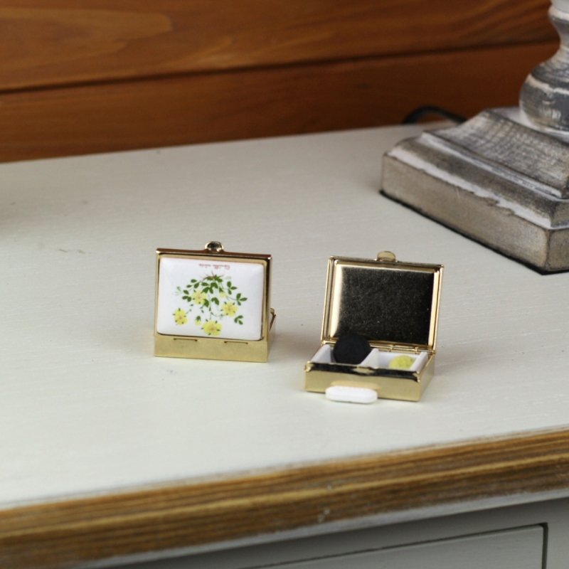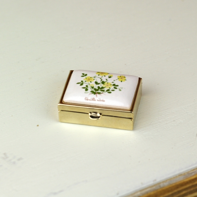 Kovový krabička má plastovou vsadku s dvěma okénky. Horní strana je zdobená motivem bylinky se žlutými kvítky.