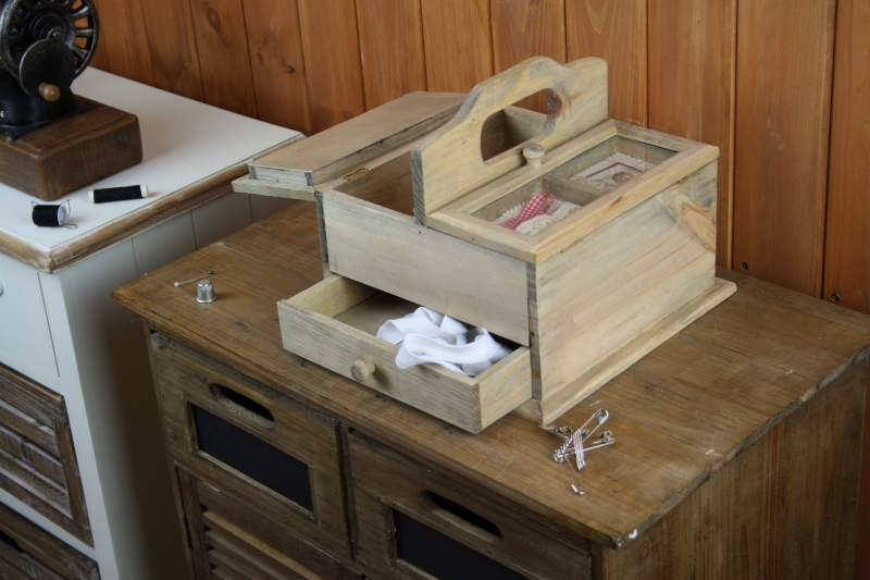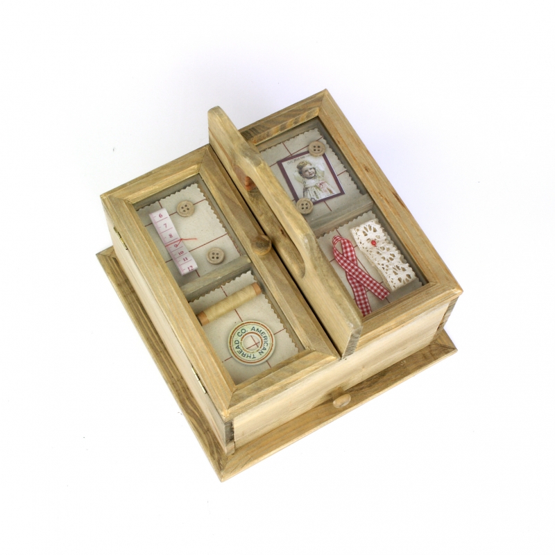 Dřevěná krabička na šití s podestou 22 x 22cm, má výšku 22cm a včetně dřevěného držátka 36cm.