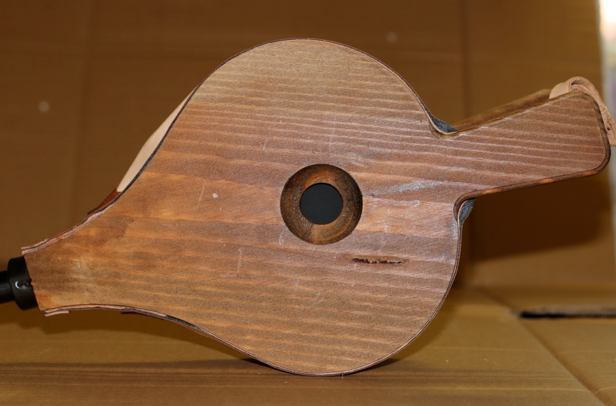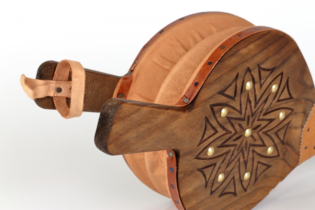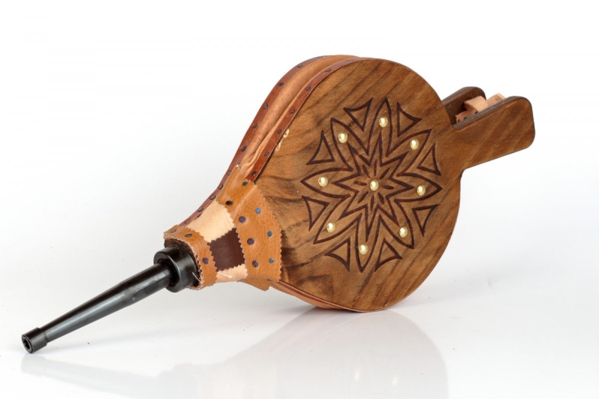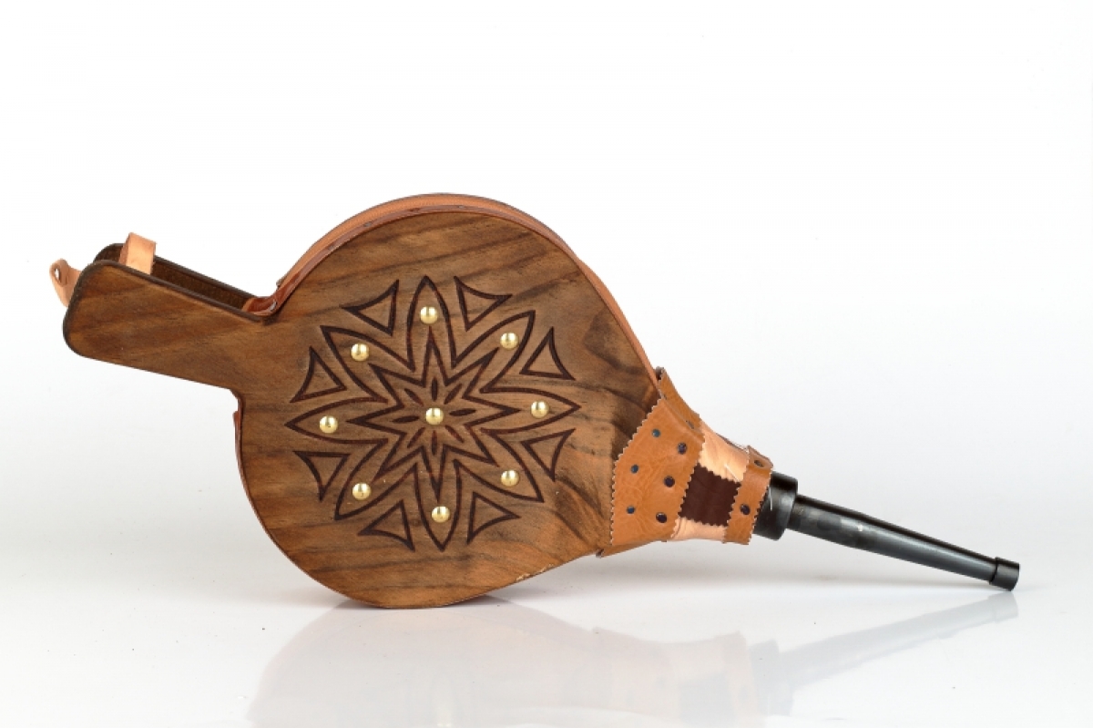 Funkční krbové dmychadlo je vyrobené ze dřeva, zdobené vypalováním, cvočky a doplňky z pravé kůže.