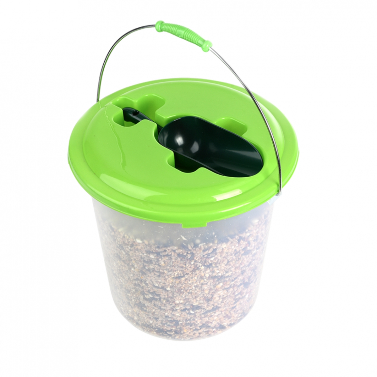 Krmení pro venkovní ptáky v kyblíku s lopatkou.