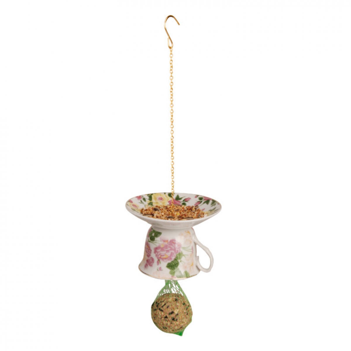 Krmítko na lojové koule a zrní v podobě šálku s květinovým motivem v krémovo-růžové barvě