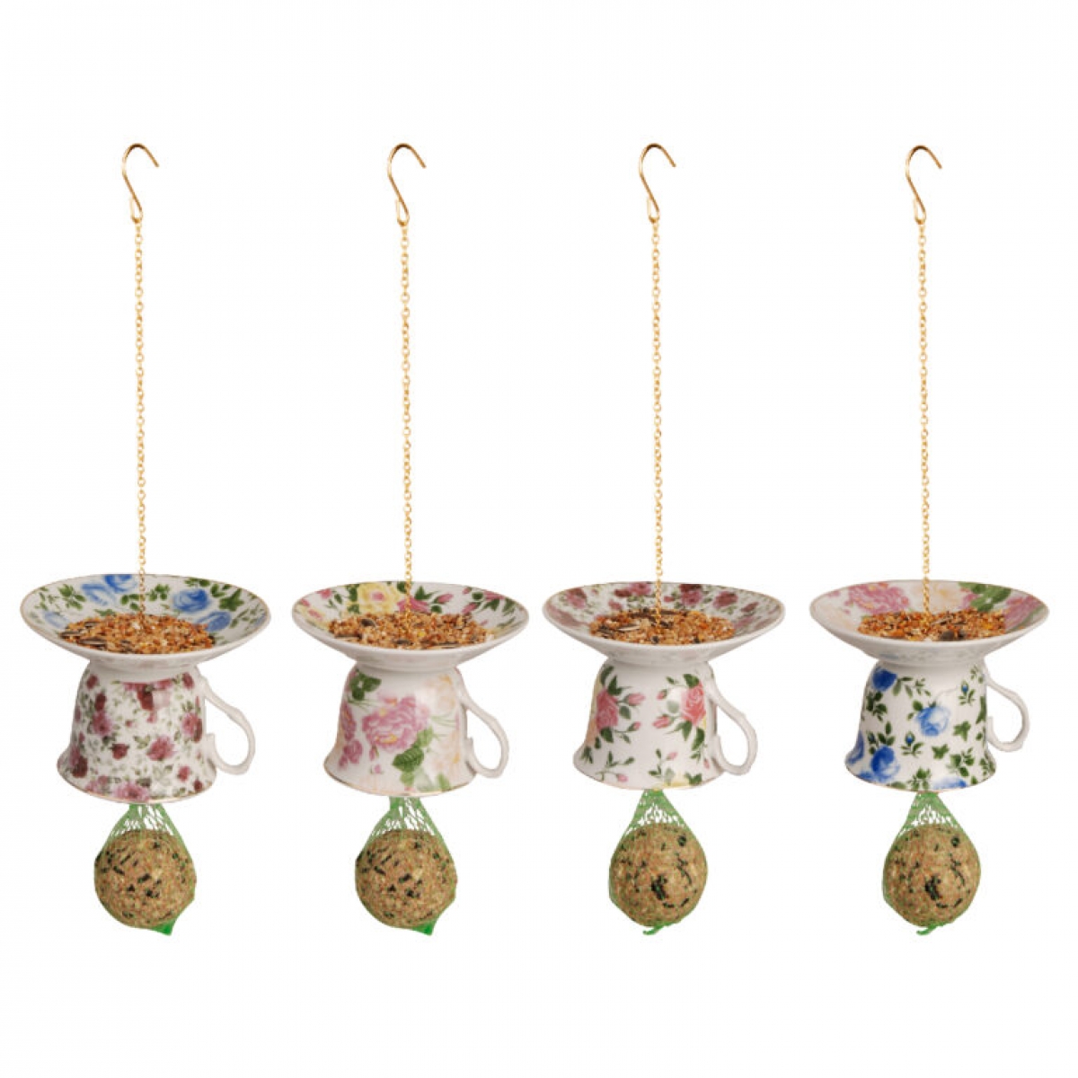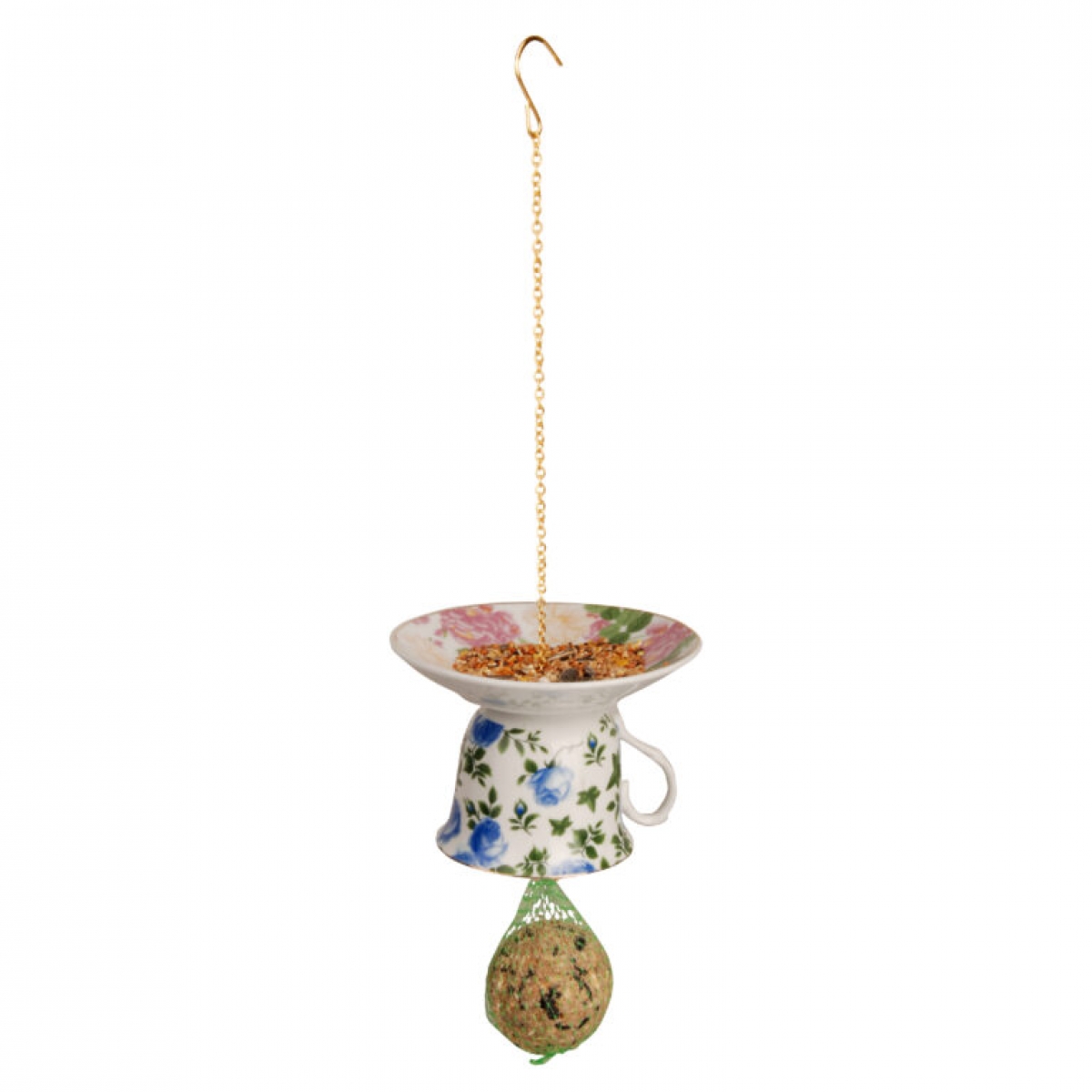Krmítko na lojové koule v podobě stylového šálku s podšálkem s květinovým motivem v modré barvě