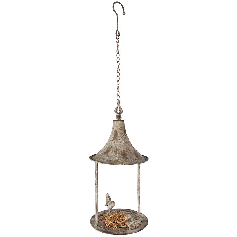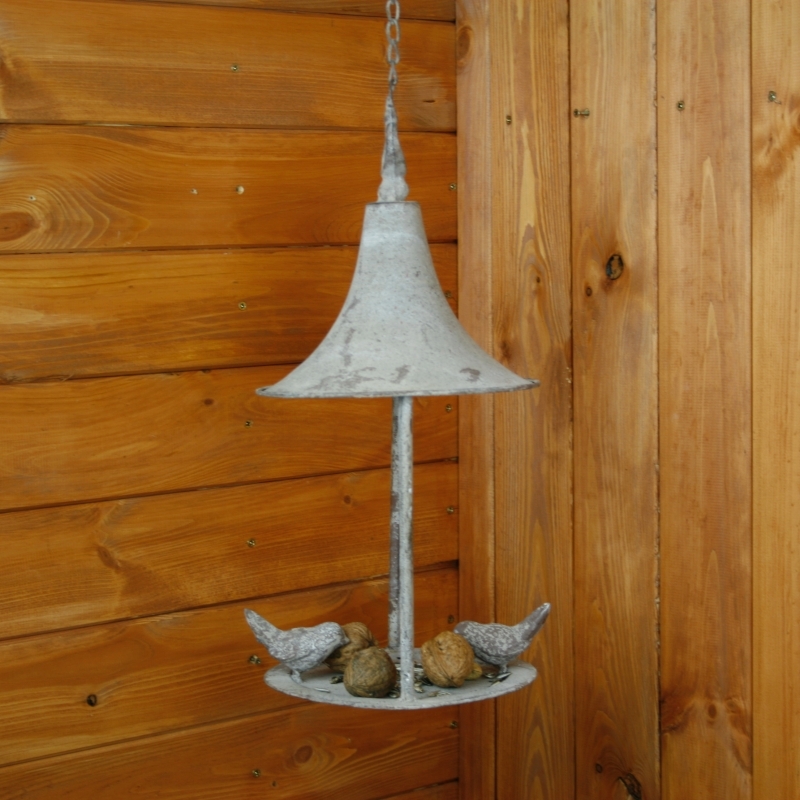 Krmítko je kovové se stříškou a dvěma replikami ptáčků na každé straně.