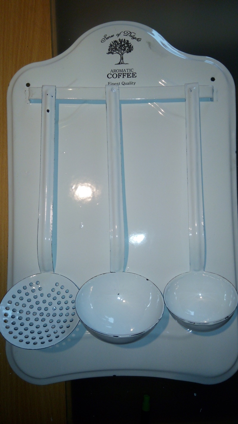 Kuchyňské náčiní z bílého smaltu, set 3 kusů. Tato sada 2 naběraček a jednoho minicedníku na smaltovaném podkladě vám určitě udělá na chalupě nejen radost, ale i pomůže při vaření.