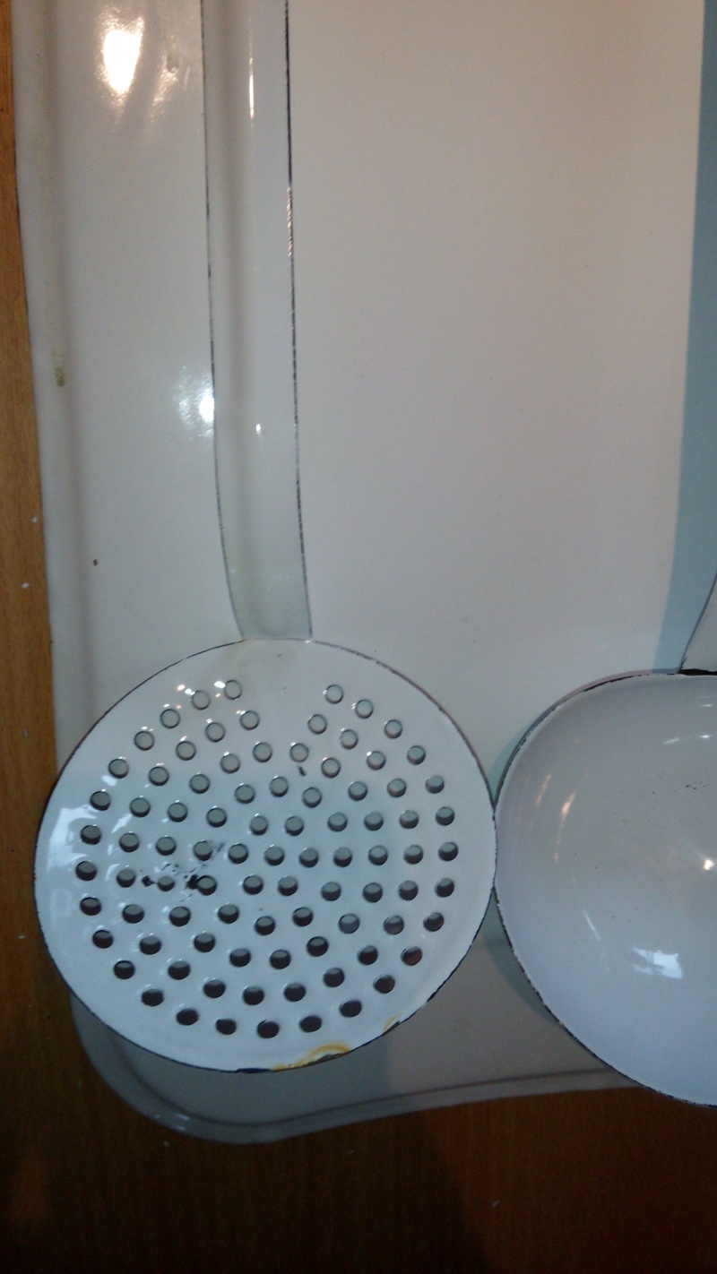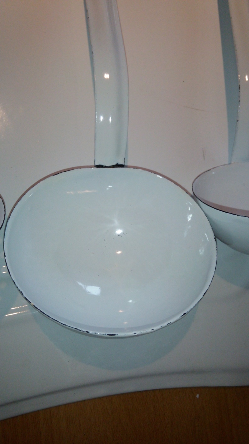 Kuchyňské náčiní z bílého smaltu, set 3 kusů. Tato sada 2 naběraček a jednoho minicedníku na smaltovaném podkladě vám určitě udělá na chalupě nejen radost, ale i pomůže při vaření.