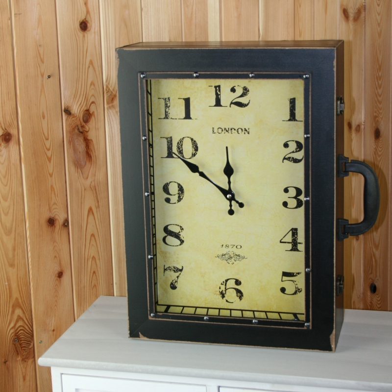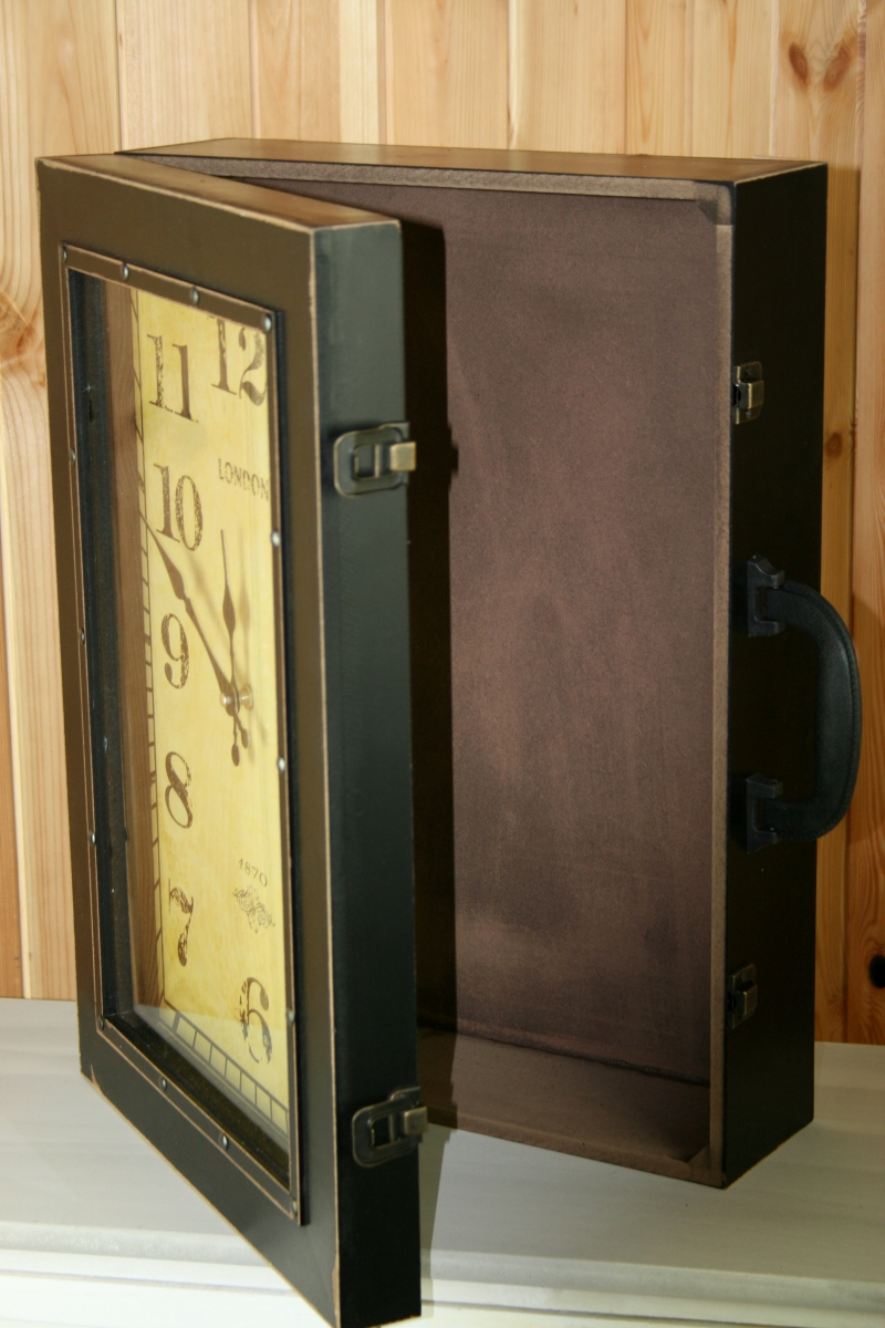 Kufřík má originální úchytku a zámky, které připomínají starý kufr. Na přední straně skříňky jsou navíc hodiny, které nám ukazují přesný čas.