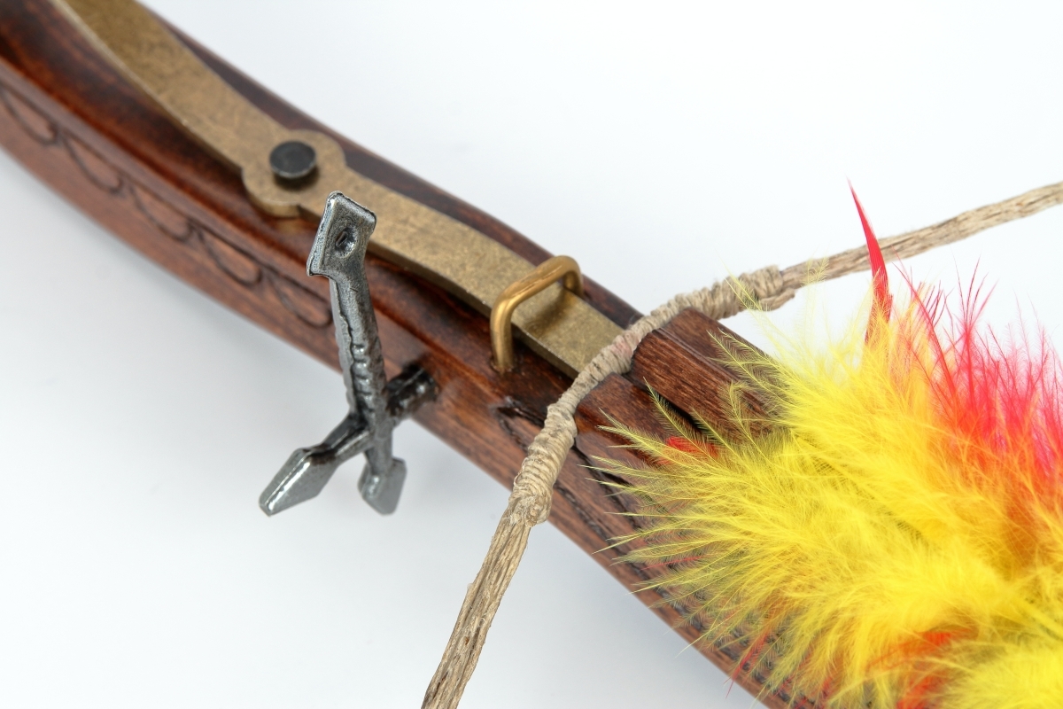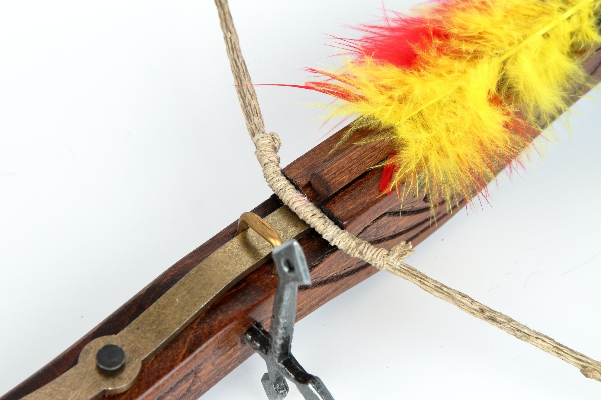 Nefunkční replika historické primitivní kuše s horním spouštěcím mechanismem vyrobená ze dřeva a šedého a bronzového kovu s dřevěnou šipkou. Pro tento svůj jednoduchý mechanismus, je často nazývána promitivní kuše.