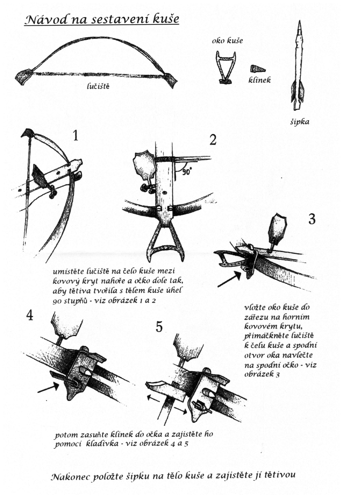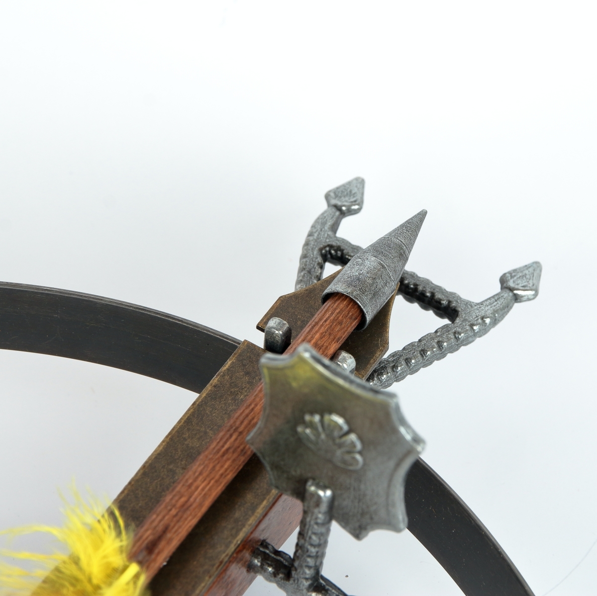 Kuše je vyrobena ze dřeva s ručně vyrobenými řezbami, šíp s kovovým hrotem a peříčky, ocelový oblouk, mechanismus a komponenty z leštěného kovu.