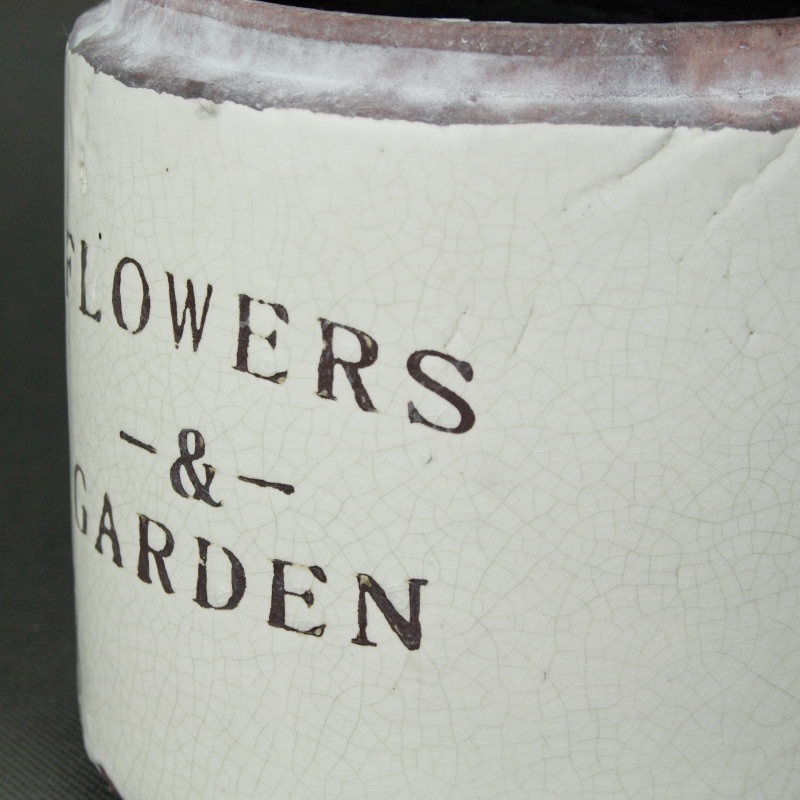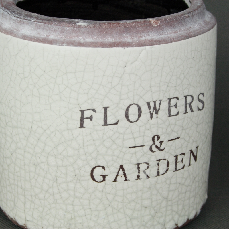 Květináč s nápisem FLOWERS & GARDEN s bílou popraskanou glazurou a fialovým okrajem. Rostliny dostanou nový kabátek a mohou tak dělat radost doma nebo na zahradě.