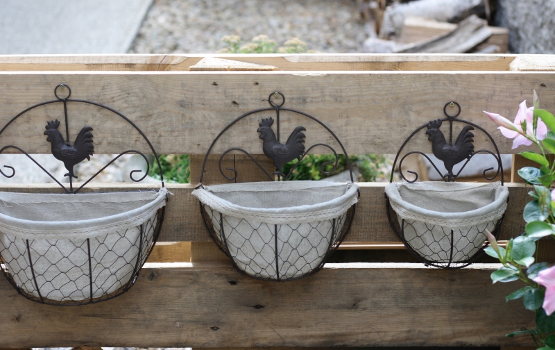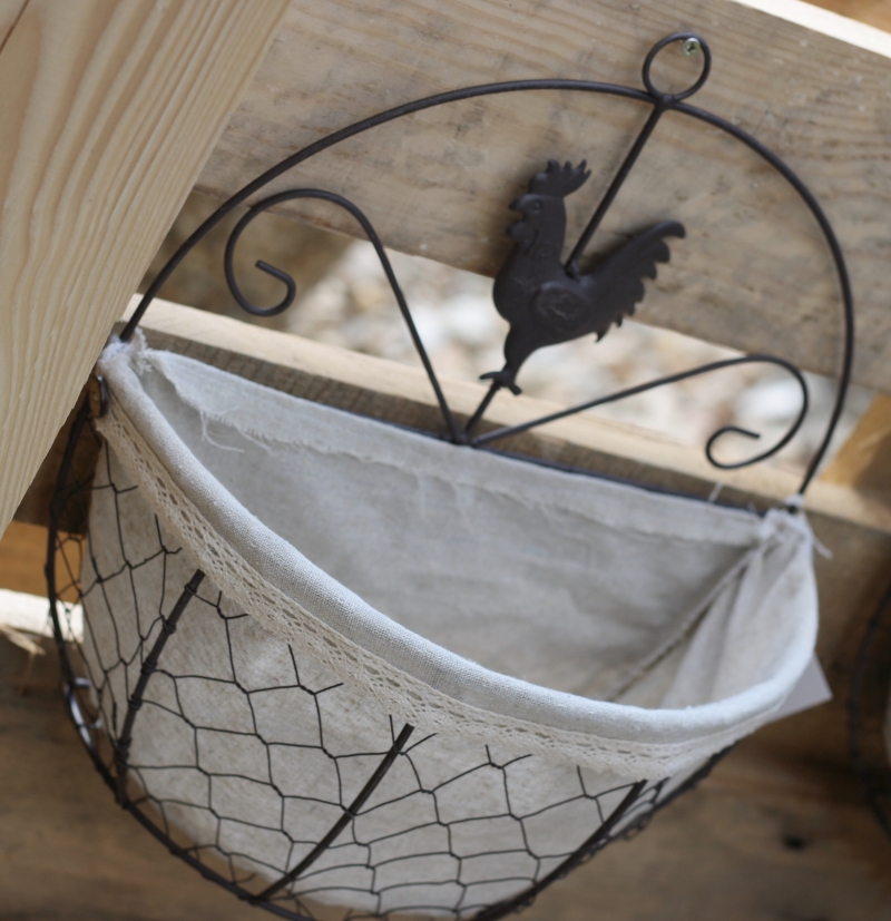 Košíky jsou kovové, boky jsou z drátěného králičího pletiva a vnitřní vystélka je z textílie. Jedná se o sadu 3ks.