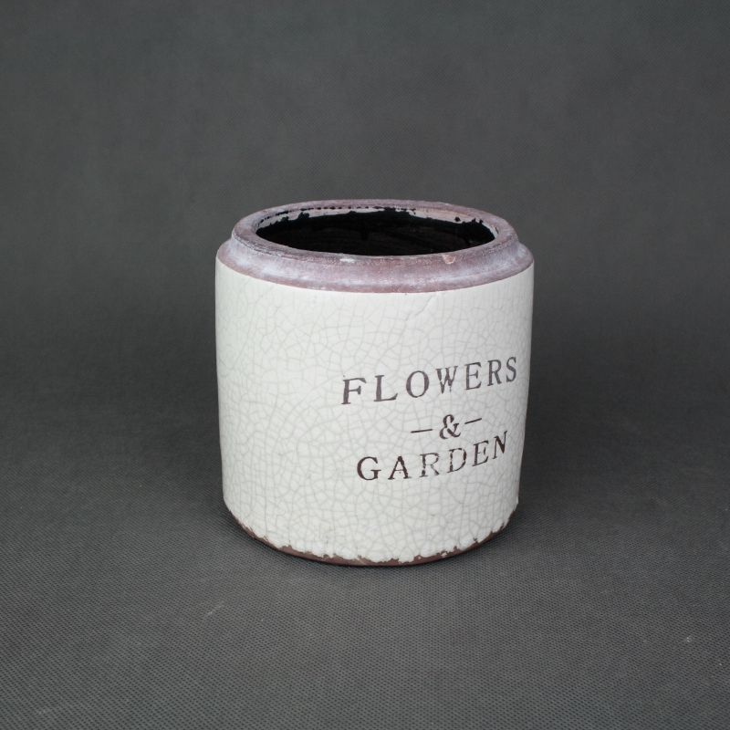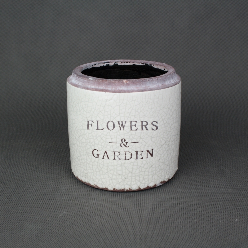 Květináč je laděn do bílo-fialové barvy. Jeho glazura má záměrně tvořit popraskaný vzhled - takovéto staro-nové věci jsou v poslední době velmi oblíbené.