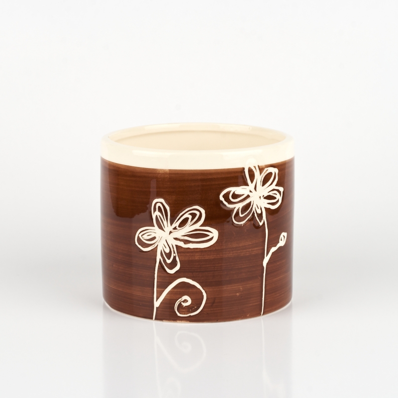 Květináč střední hnědý s motivem kytky 13x11cm, je vhodná dekorace do bytu či domácnosti.