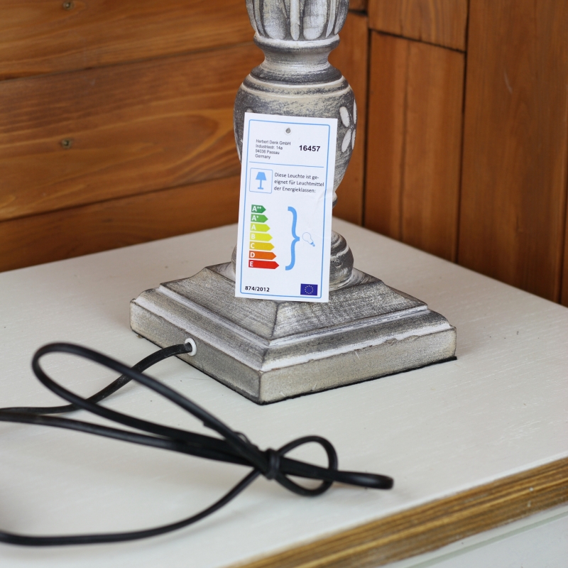 Tato noční lampa je laděná do šedivé barvy. Noha je bohatě vyřezávána a zdobena motivy malých květů. Cylindr je z šedé řasené látky doplněné o jemnou mašli.