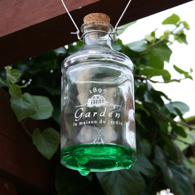 Průměr nádobky je 10 cm a výška 20cm. Nádobka je uzavřena korkovým špuntem s vnitřním otvorem 3cm. Ze spodní části je lákavý vstup pro hmyz, vyvýšený okrajem pro udržení hladiny ovocné šťávy, nebo jiné lákavé tekutiny pro vosy. Celková výška i s háčkem je 31cm.