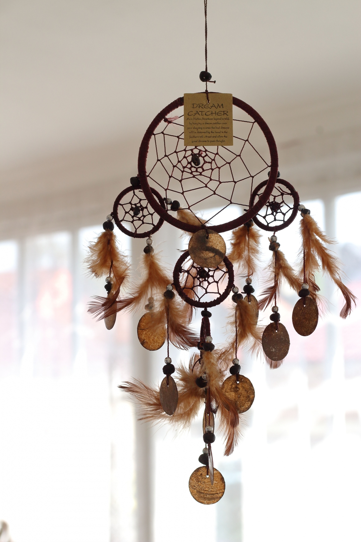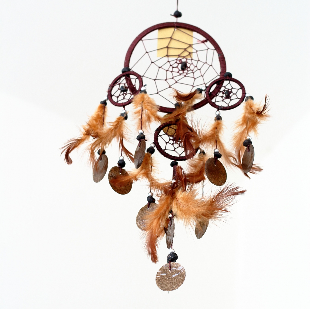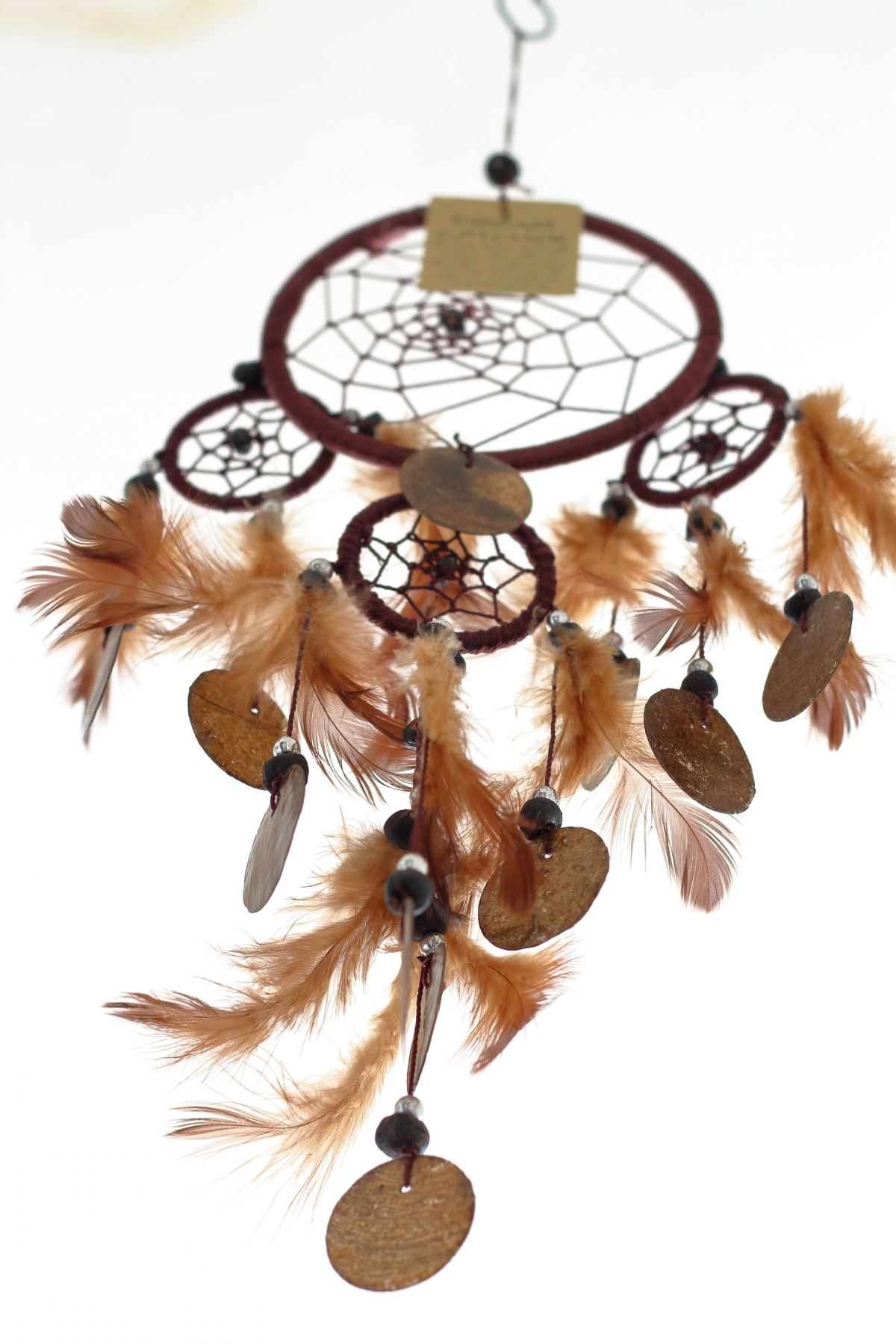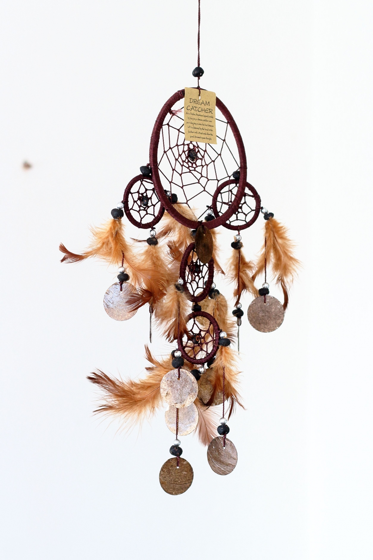 Lapač snů hnědý s penízky z mušloviny 12cm Vás ochrání v ložnici před špatnými sny. Lapač polapí všechny noční můry a nechá vás klidně spát.