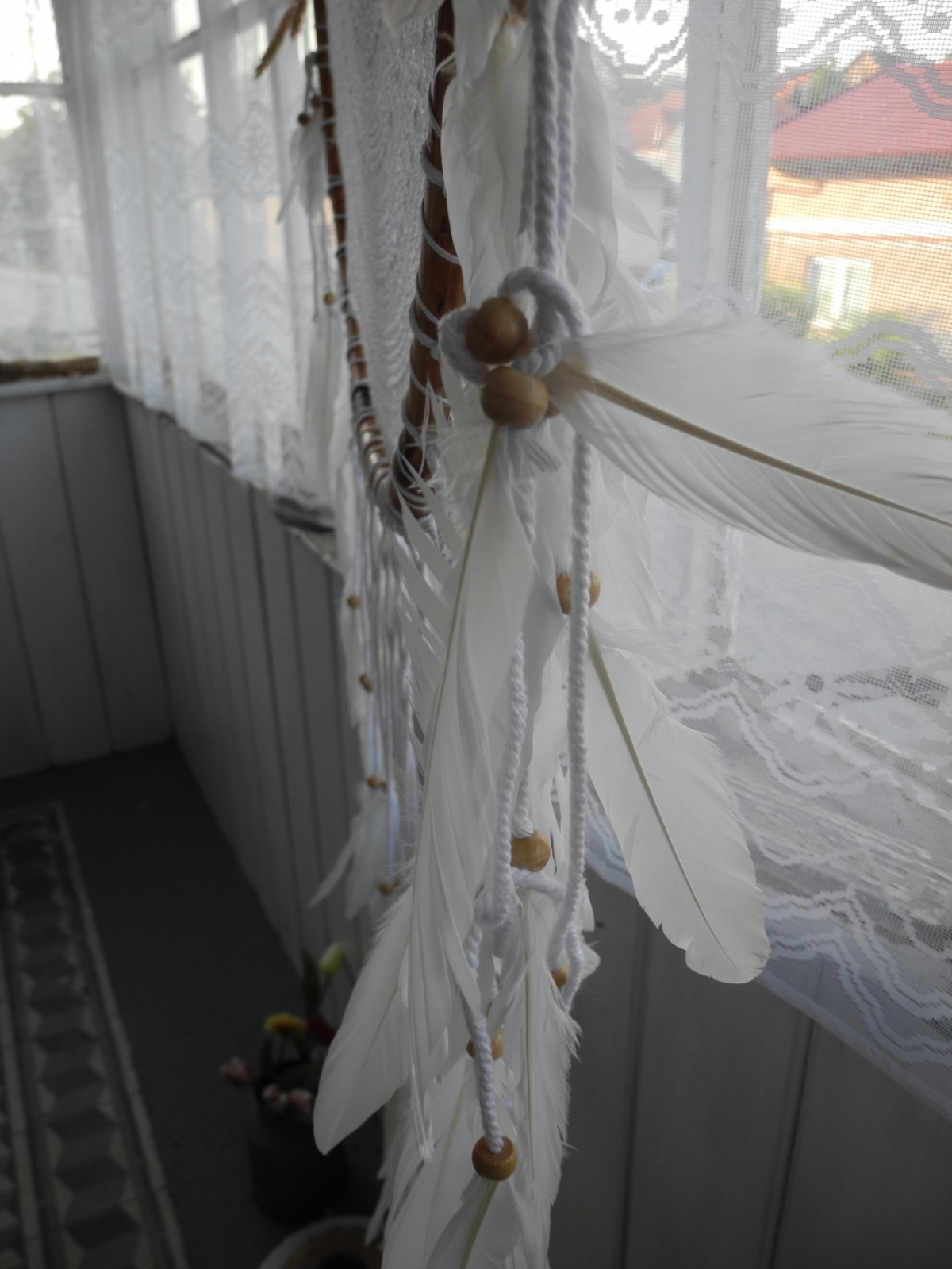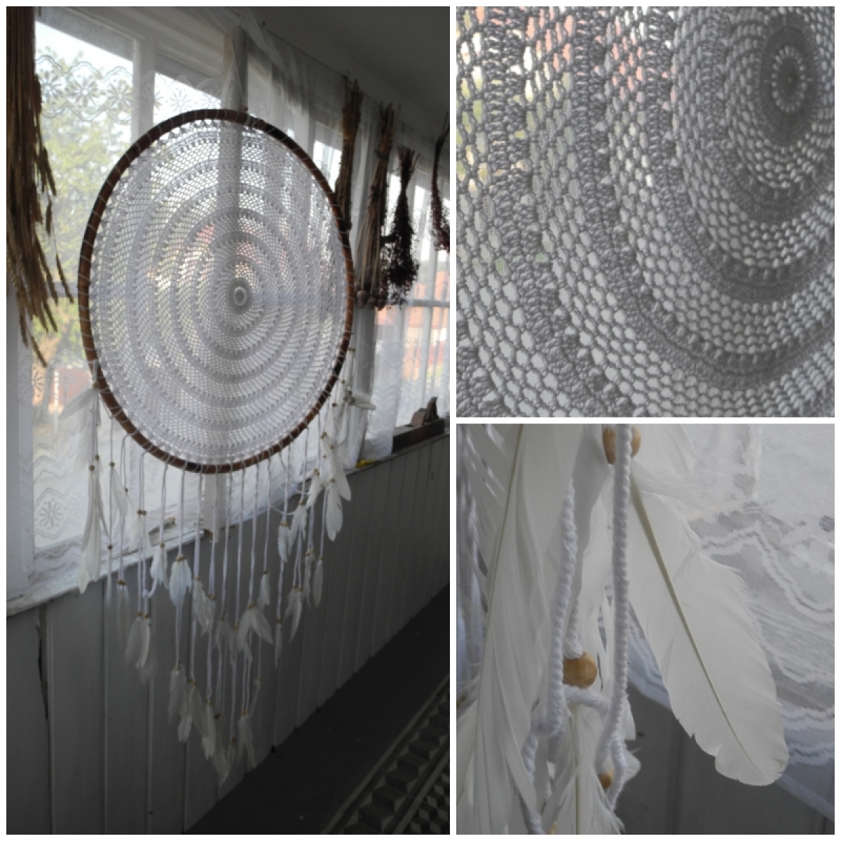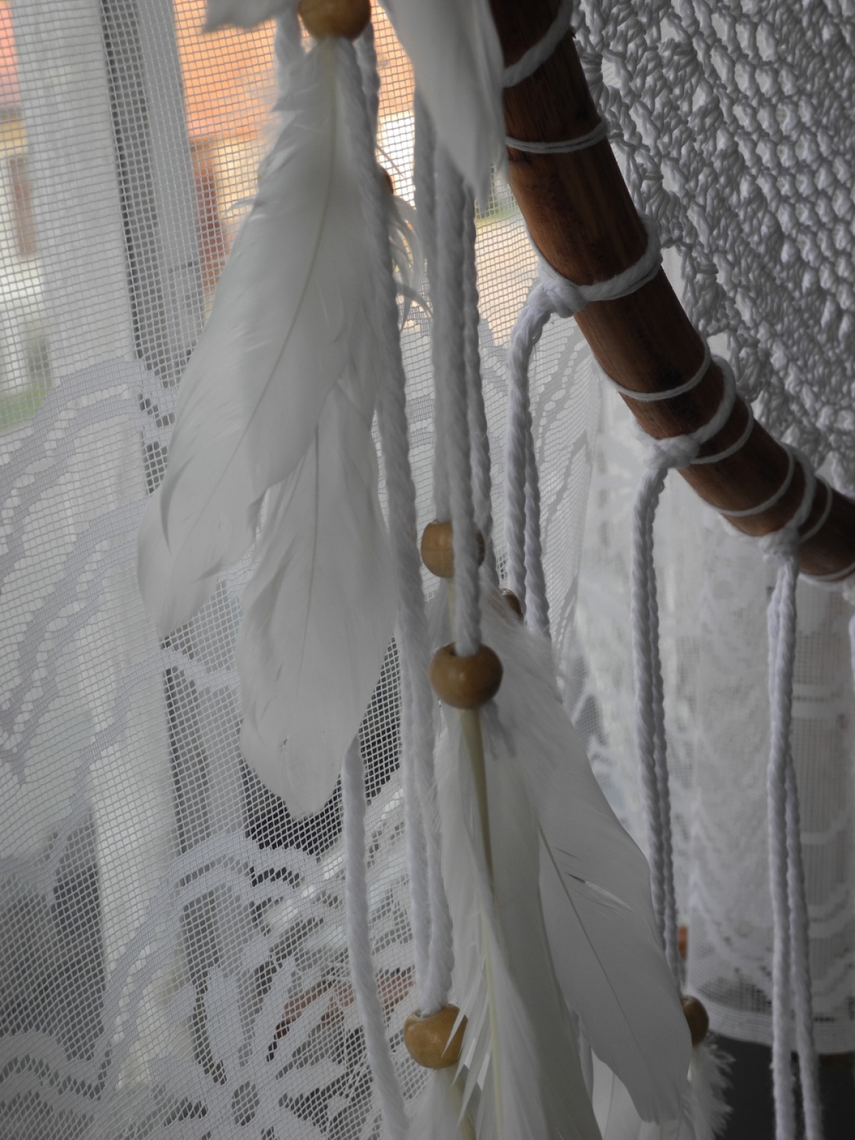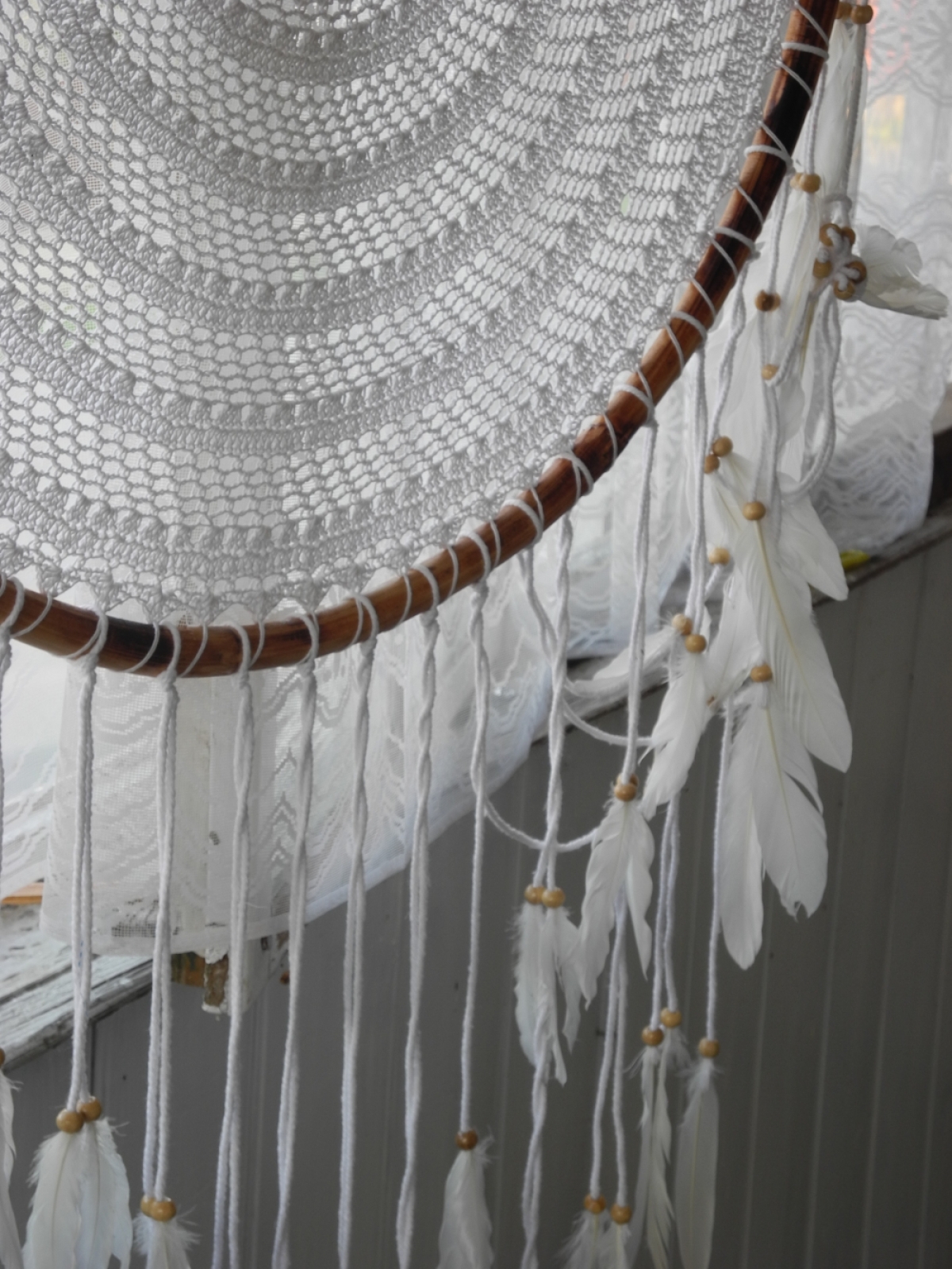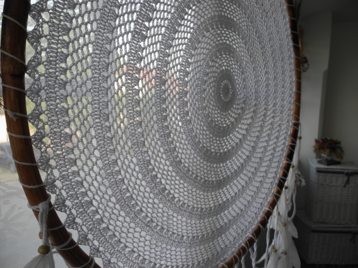 Ručně vyráběný lapač snů s krajkou a bambusovým kruhem.