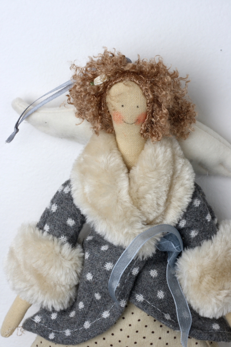 Andělka je z textilu, tělo má vycpané výplní a na hlavě má šňůrku pro zavěšení.