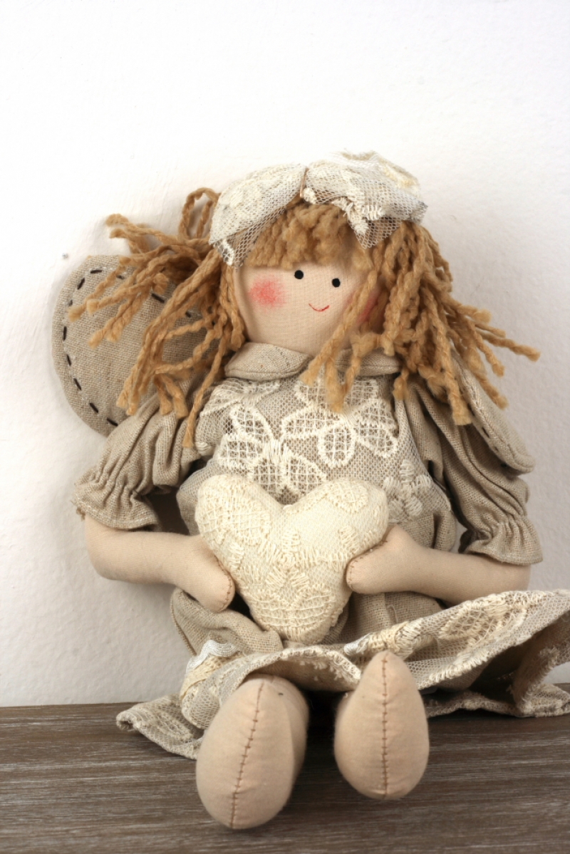 Panenka má překrásné přírodní šaty s krajkou a mašli ve vlasech. Bude krásnou dekorací na komodě či polici.
