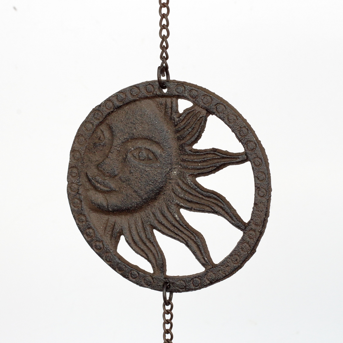 Litinový závěsný zvonek slunce v kruhu / zvonkohra 60cm rozezvoní příchozí návštěva, nebo lehký vánek. Zvuk litinového zvonku Vás bude bavit, a tak dopřejte sobě i své zahradě pěknou závěsnou dekoraci!