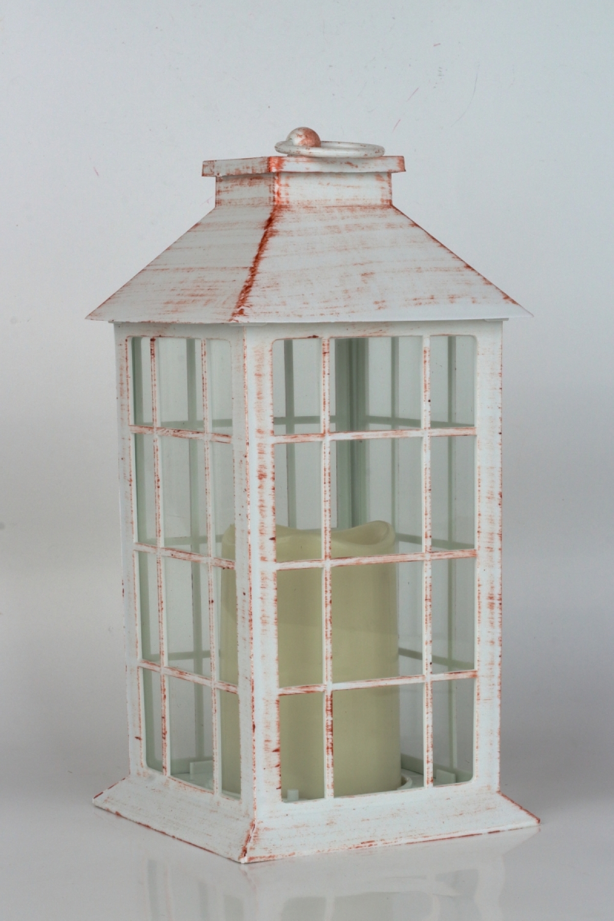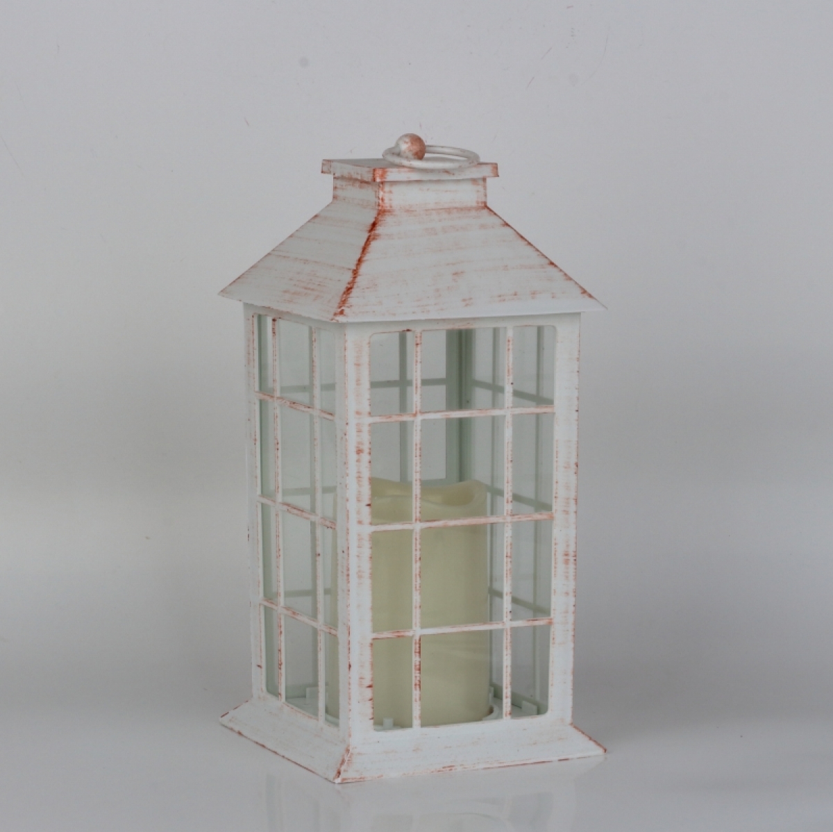 Dokonalá imitace plechové lucerny s hořící svíčkou o průměru 5,5cm a výškou 7cm.