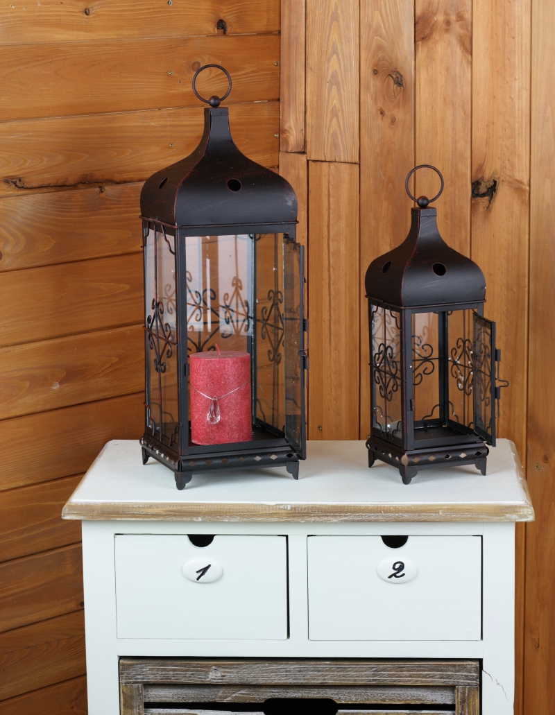 Kovové lucerny mají bohatě zdobené boční skleněné stěny. Krásně v nich vynikne velká bílá svíčka. Jemné tlumené světlo navíc vykouzlí úžasnou atmosféru při večerním posezení v pohodlí domova nebo i venku na terase.
