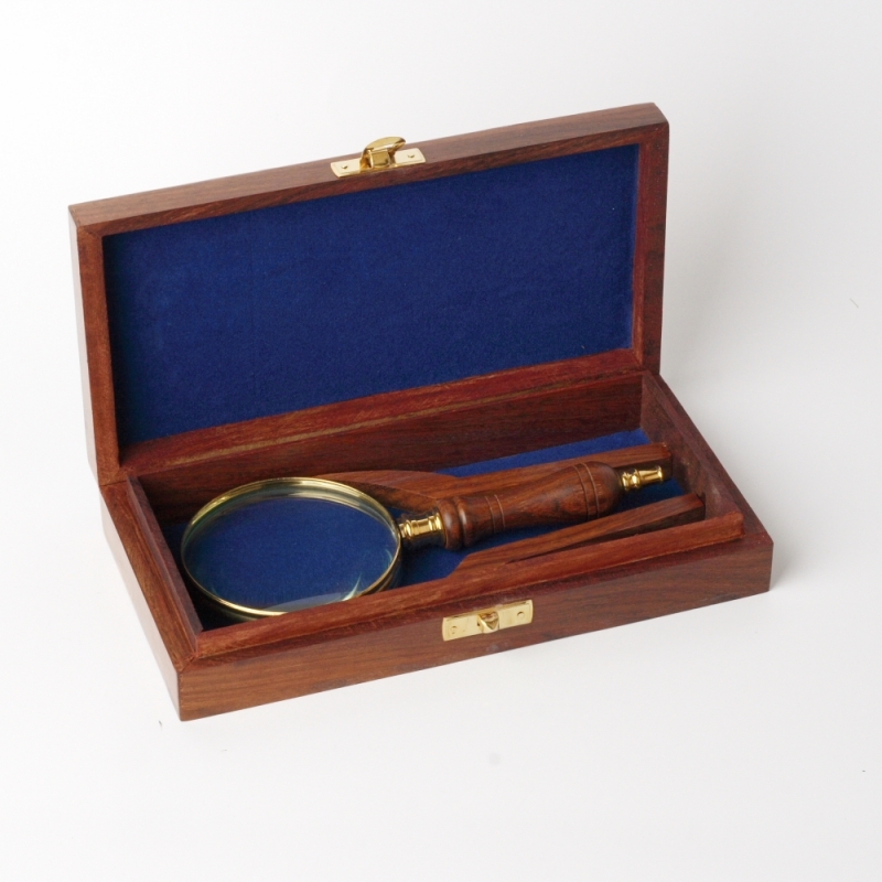 Stylová krabička s lupou může být součástí vitríny v pracovně nebo psacího stolu, kde bude čekat na chvíli, kdy ji využijete k luštění drobného textu.