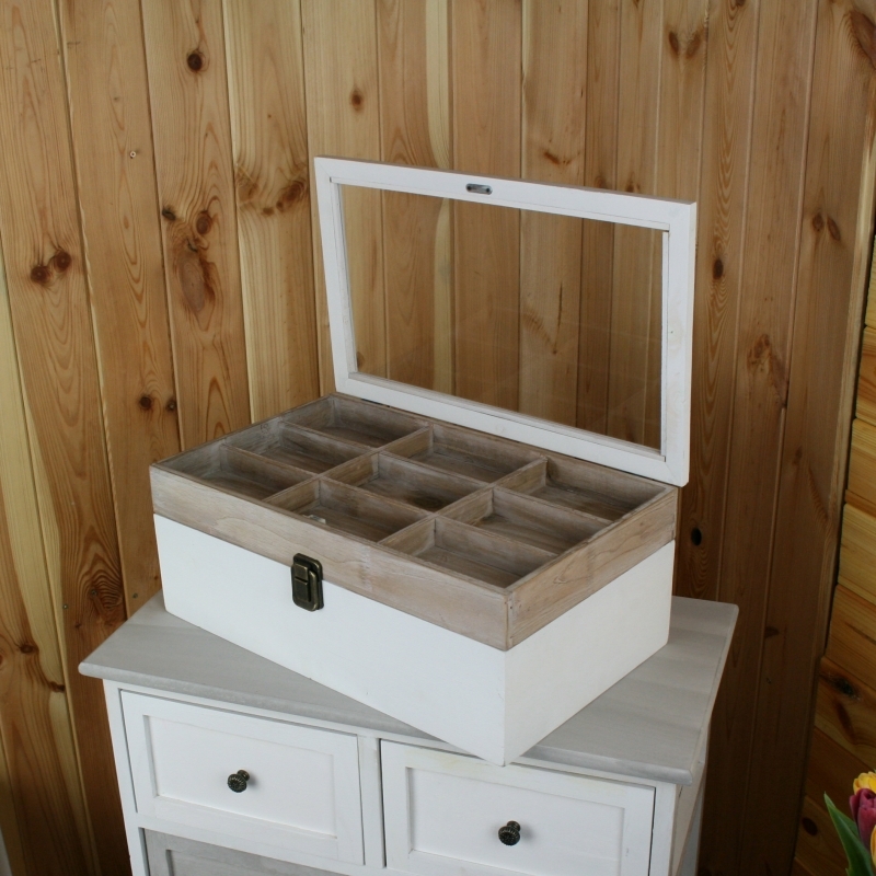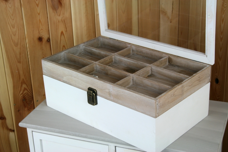 Šperkovnice má dvojité víko - vrchní část s přihrádkami a spodní část krabice bez dělení.