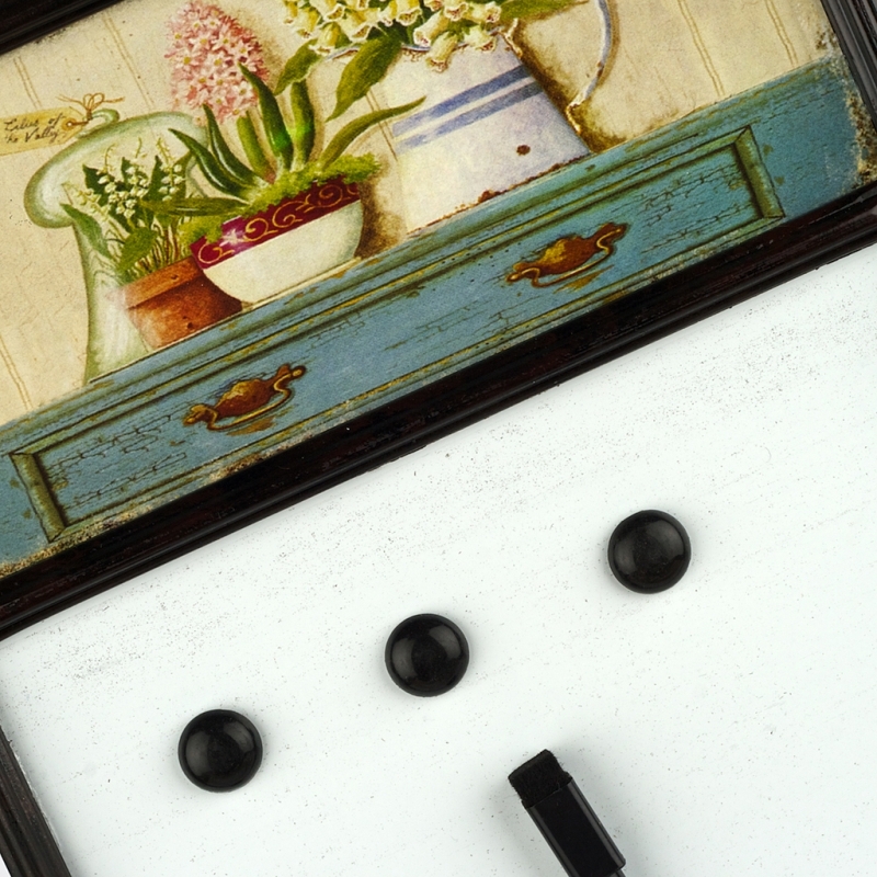 Součástí balení je psací fix s mazací houbou a třemi magnetky.