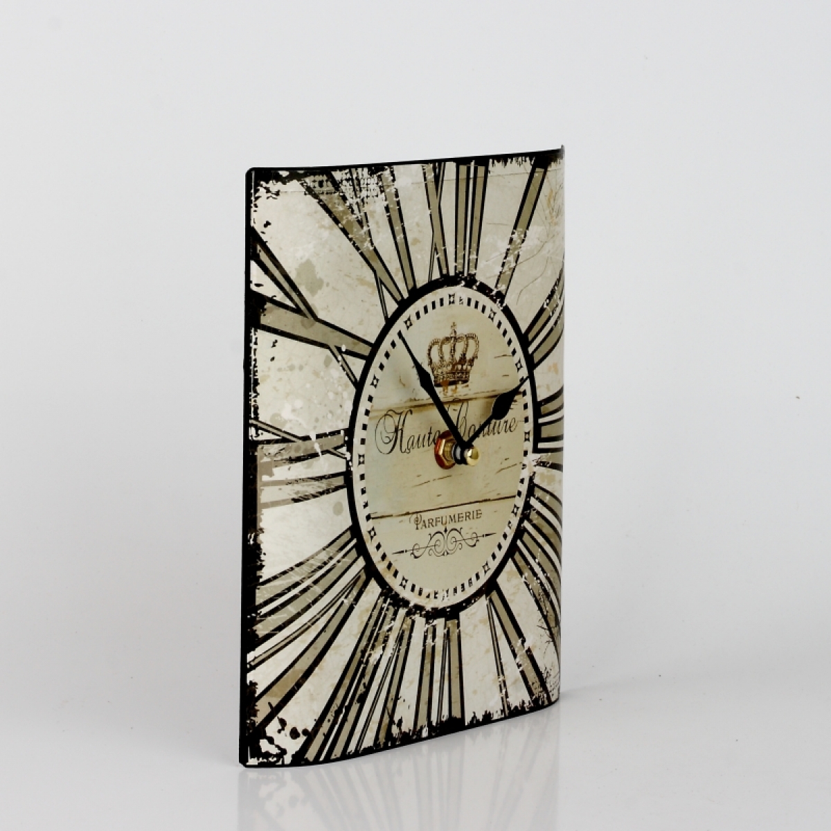 Malé nástěnné hodiny Parfumerie 17,5x21cm mají neobyčejně prohnutý ciferník. Celé hodiny jsou z kovu a jejich hrany jsou elegantně zahnuté. Na zdi tak působí plasticky a velké římské číslice a oprýskaná vzhled společně tvoří velmi oblíbený starobylý vzhled.
