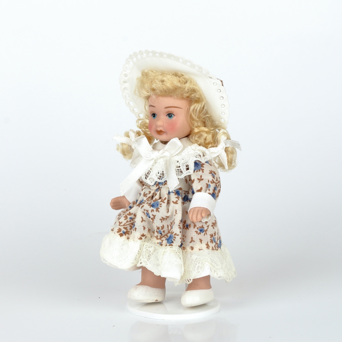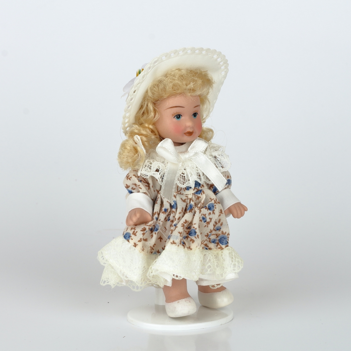 Mini panenka je vyrobená z porcelánu s látkovými šaty a kloboukem.