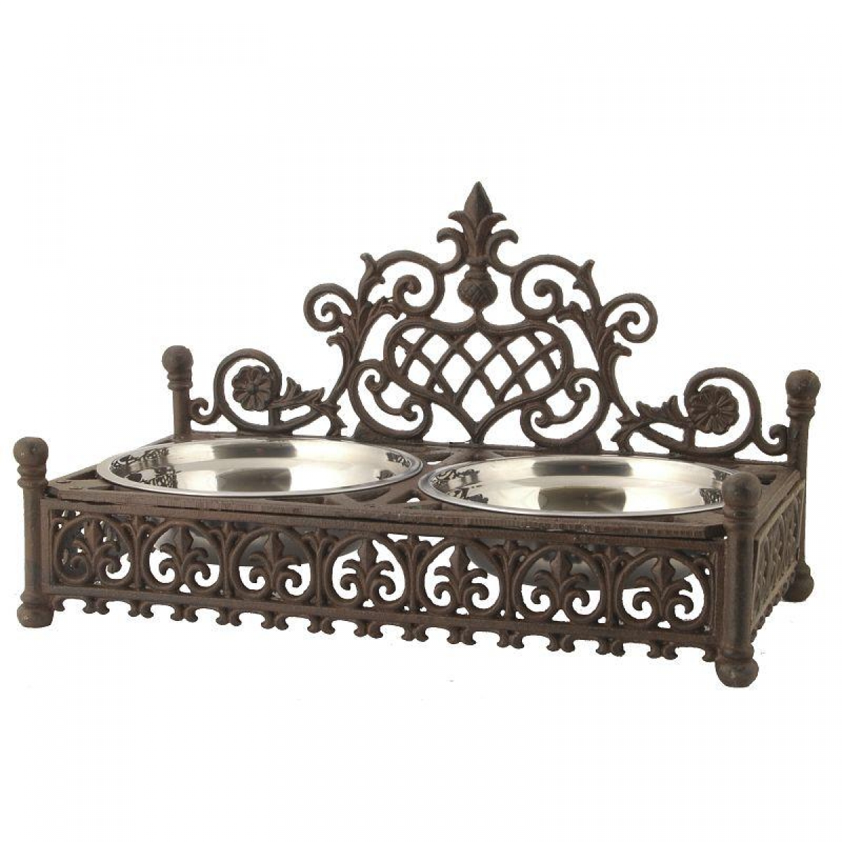 Miska na žrádlo pro psy 46x25x27cm. Krásný litinový zdobený stojan pro Vašeho nejlepšího přítele, ve kterém jsou zasazené dvě misky. Misky lze jednoduše vyjmout a umýt.