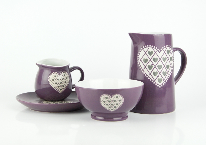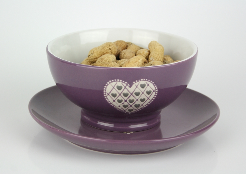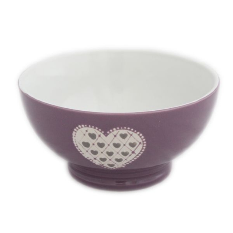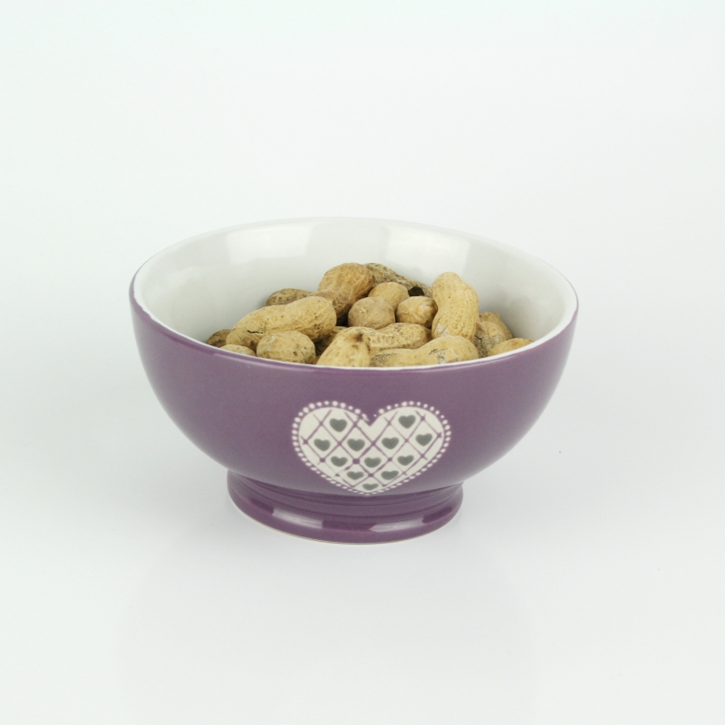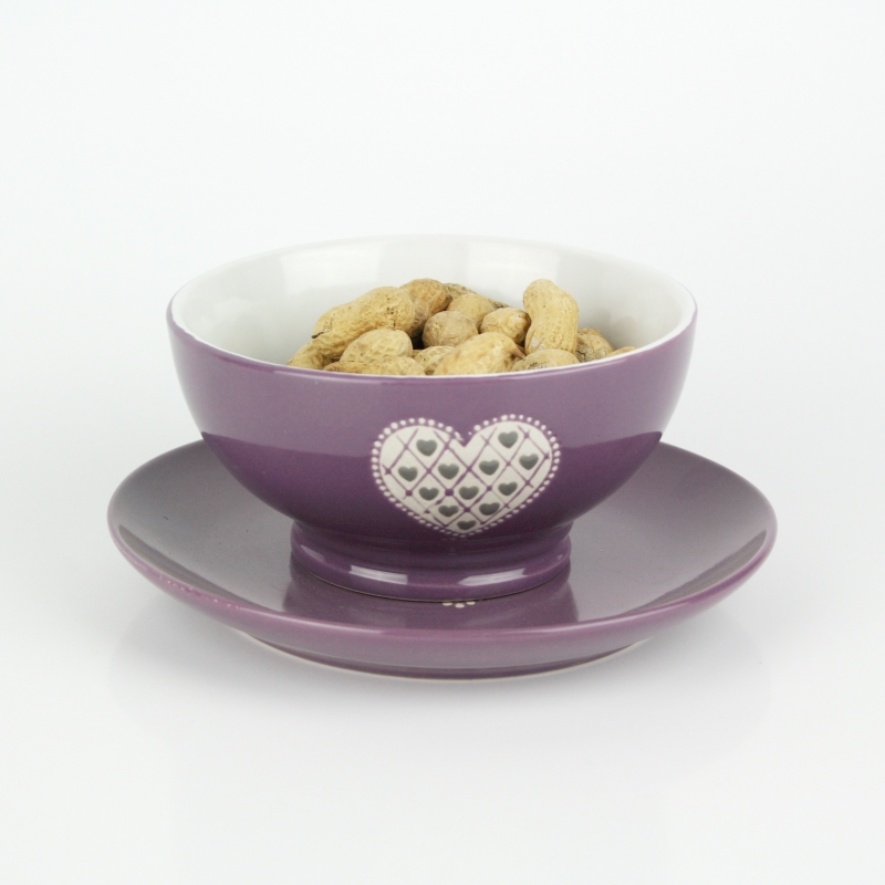 Miska má krásnou levandulovou barvu a je ručně zdobená. Přední stranu zdobí motiv srdce. Miska je velmi praktická, můžete v ní servírovat polévku, cereálie s mlékem nebo třeba oříšky.