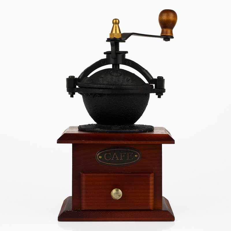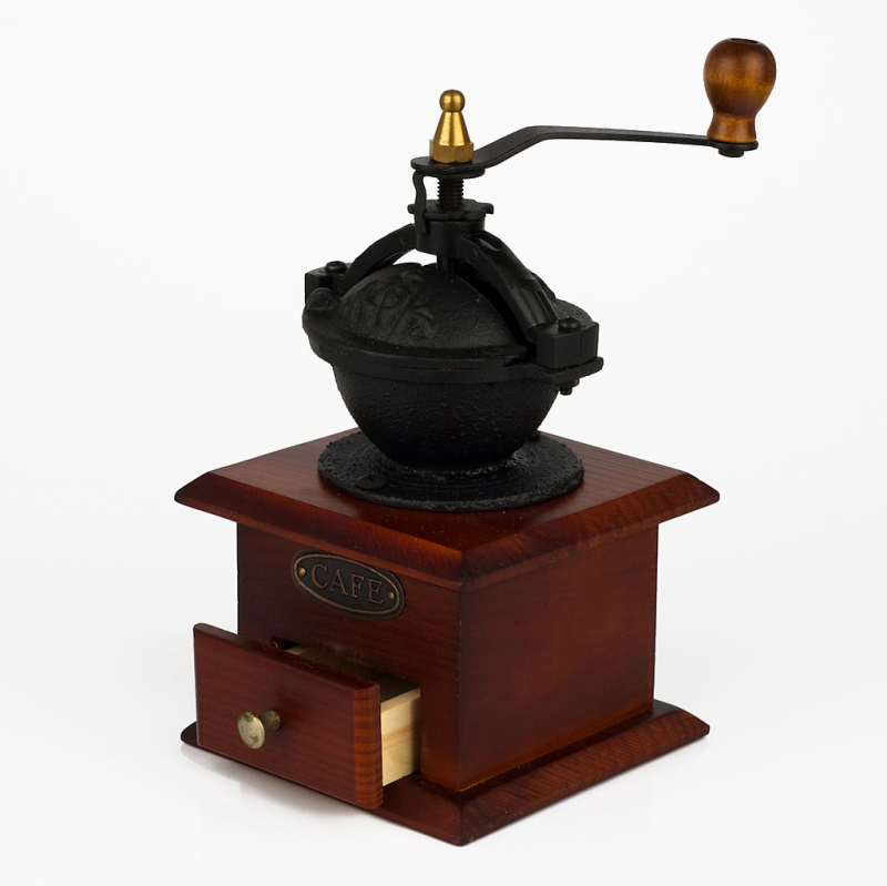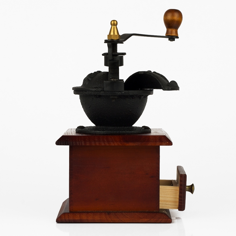 Mlýnek na kávu dřevo-litina. Plně funkční replika ručního mlýnku na kávu. Vrchní část mlýnku a mlecí zařízení je vyrobeno z litiny a železa. Samotný mlýnek a šuflátko na pomletou kávu je ze dřeva. Celkové vnější rozměry mlýnku: v22,š12, šířka s kličkou 15cm