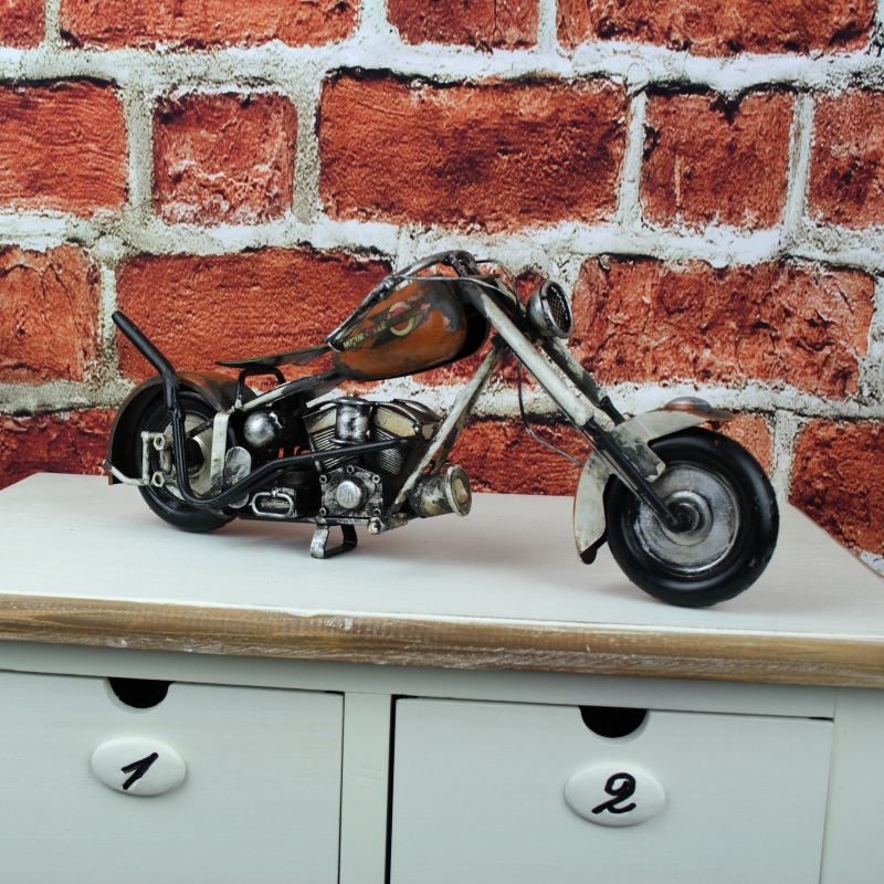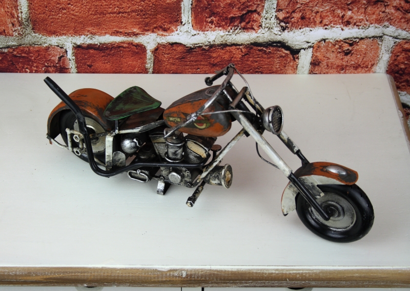 Kovová motorka o celkové délce 37cm a výšce 16cm je ručně vyrobena pouze ze železa a plechu.