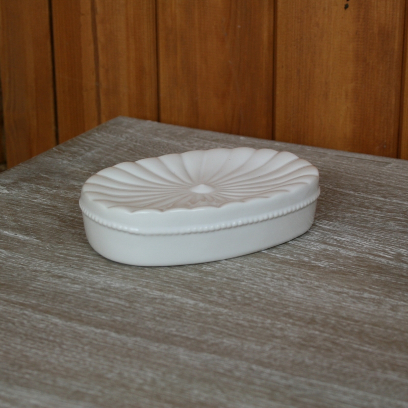 Mýdlenka je vyrobena z kvalitní keramika a má bílou barvu. Odkládací plocha je žebrovaná pro zamezení sklouzávání mýdla, po stranách je drobné zdobení.
