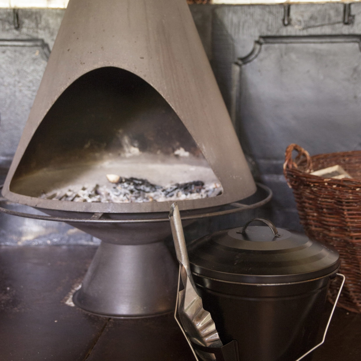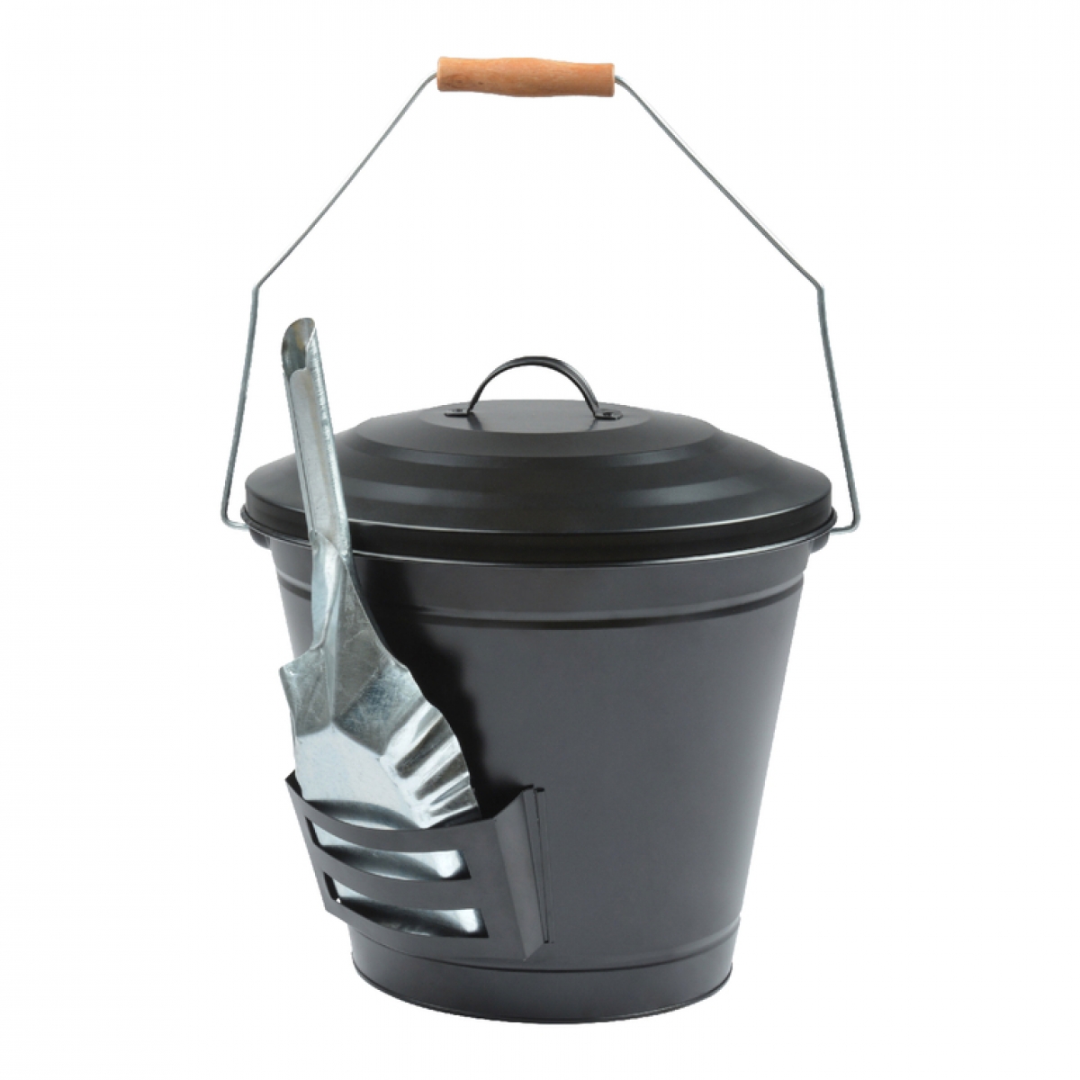 Nádoba na popel s poklicí a dřevěným úchopem je ideální pro vybírání a uklízení popele z ohnišť nebo krbů. Lopatka, která je součástí balení, se dá umístit do stojánku na boku nádoby.