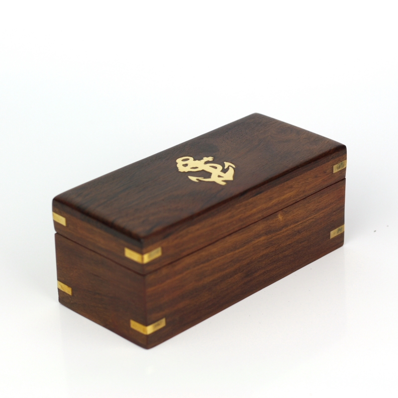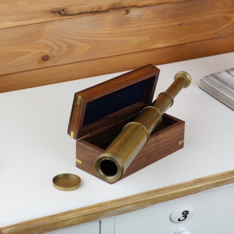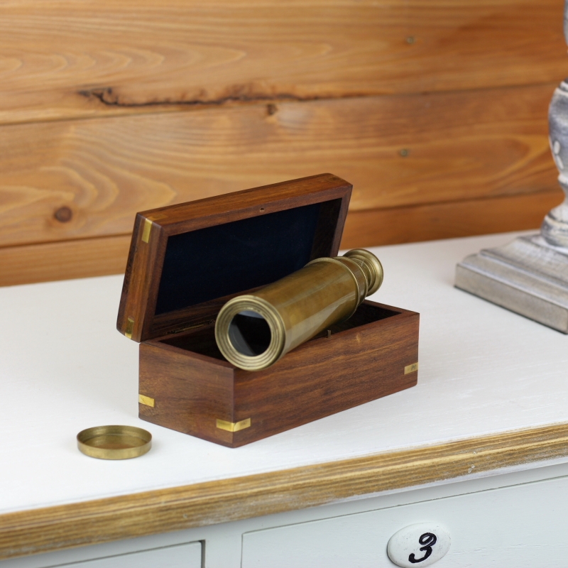 Mosazný dalekohled se čtyřmi trubicemi je vložen do krásné dárkové krabice z palisandru. Krabice je zdobena mosaznými vložkami a na víku motivem kotvy.