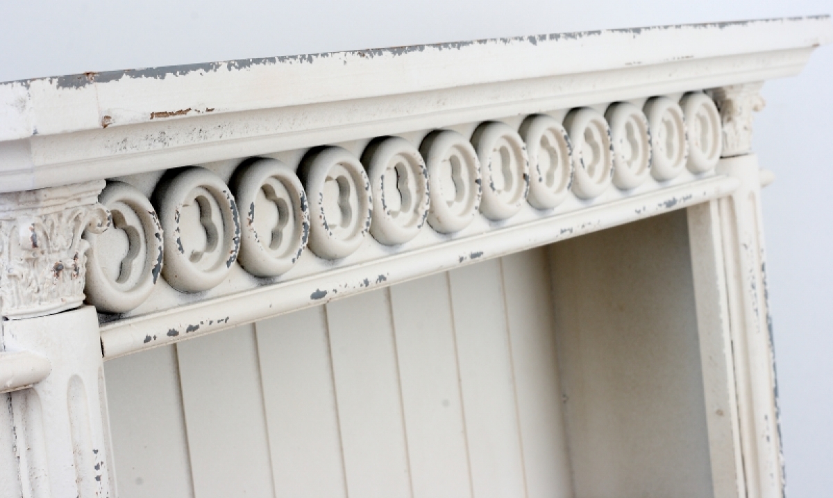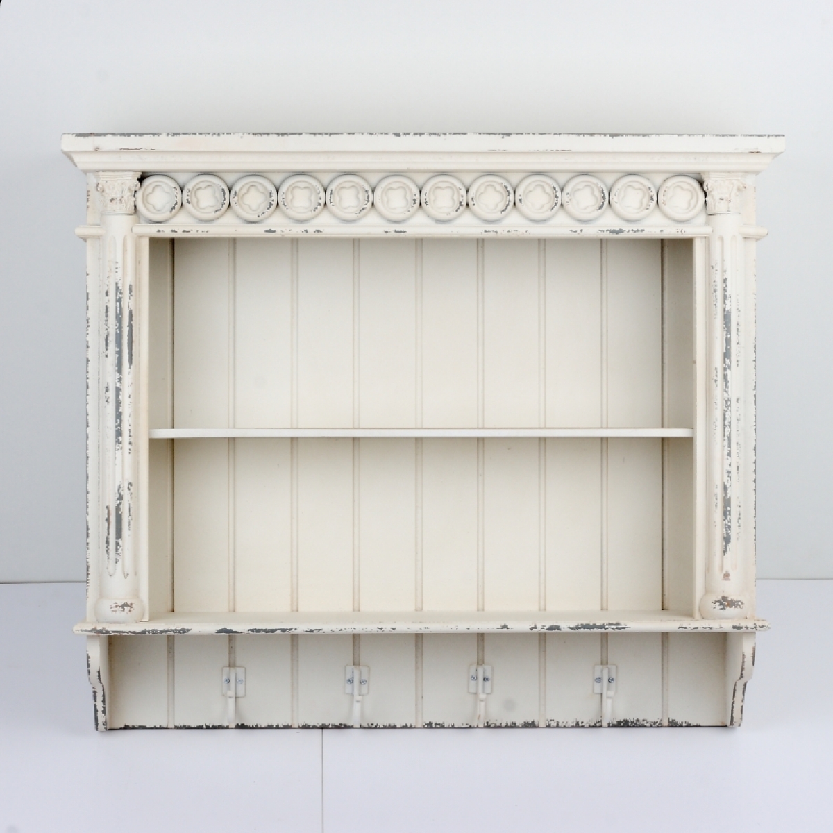 Police má zdobenou římsu i boční strany. Za policemi je viditelný krásný prkenný vzhled. Ve spodní části má police 4 kovové háčky.