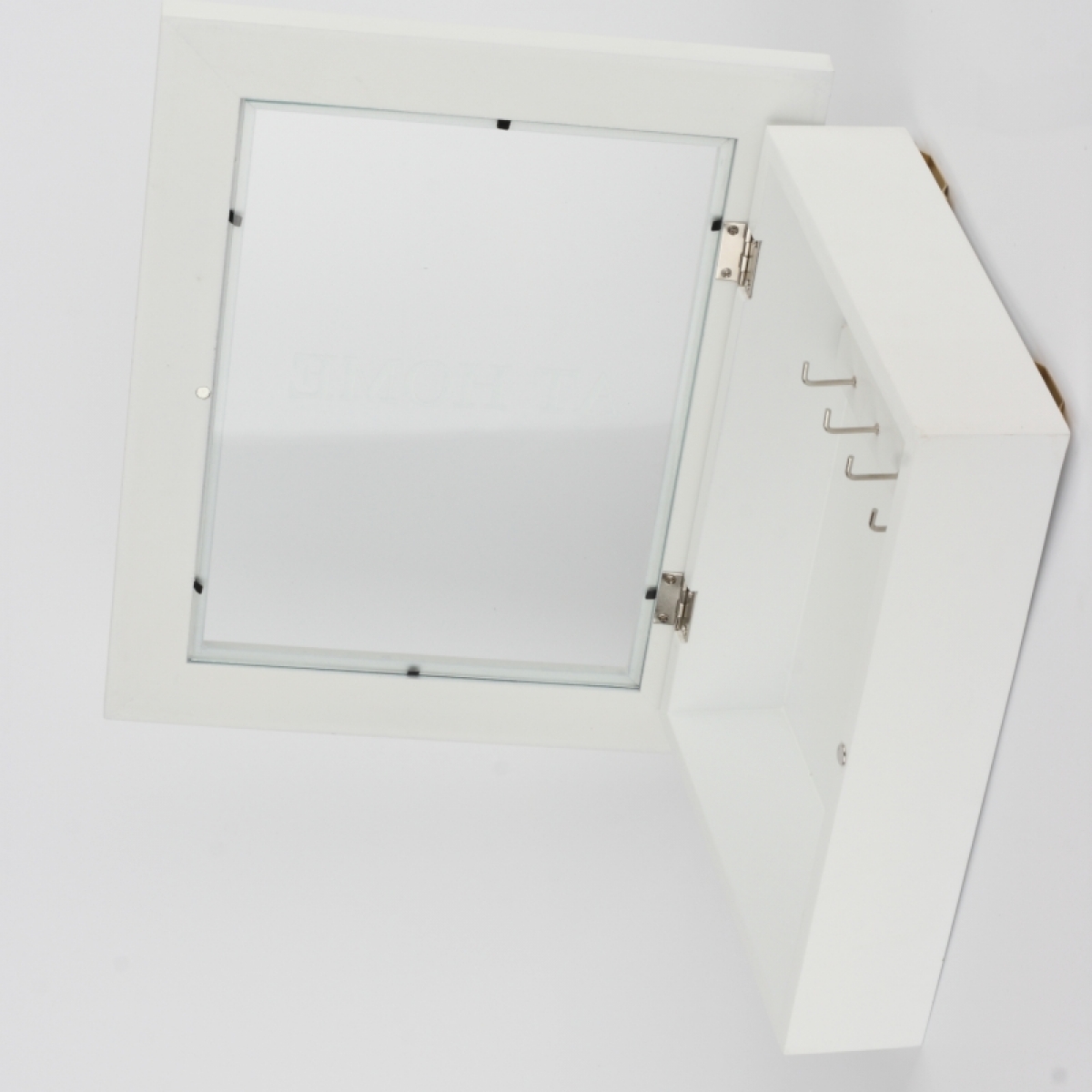 Dřevěná skříňka má prosklená dvířka a uvnitř 5 háčků. Na zadní straně má kovové packy na zavěšení na stěnu.