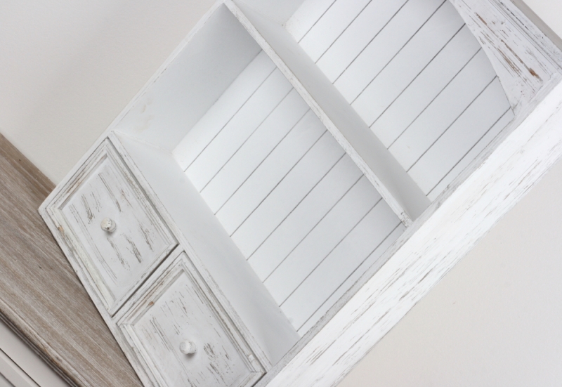 Povrch skříňky je natřený bílou barvou s výraznou patinou a oprýskanými rohy. Nad vrchní policí je navíc zdobená římsa.