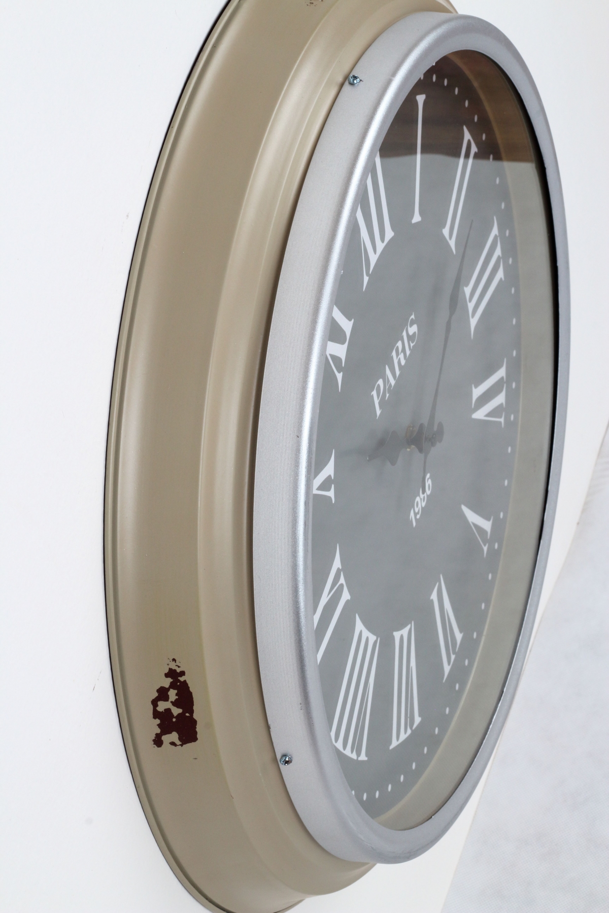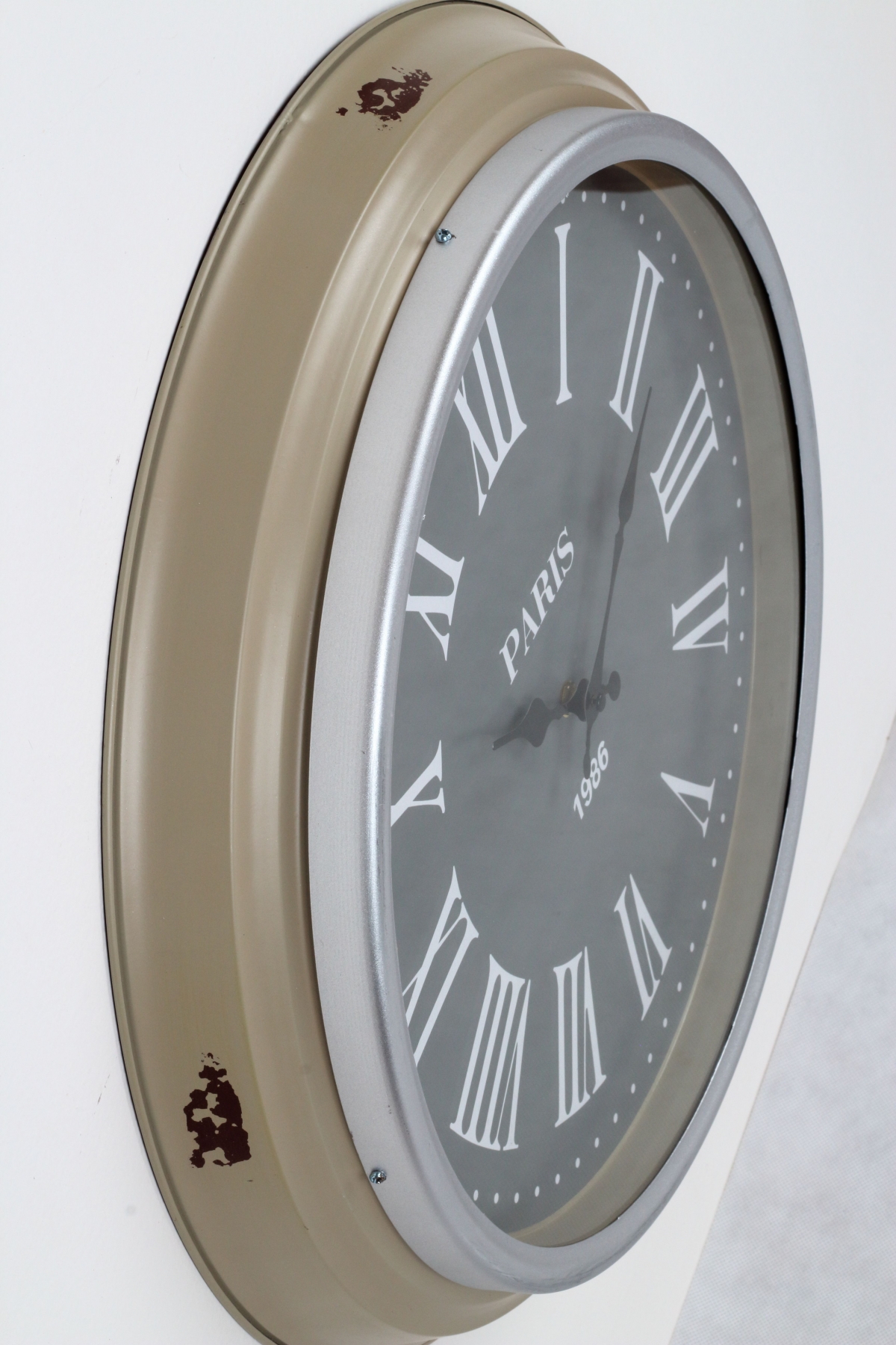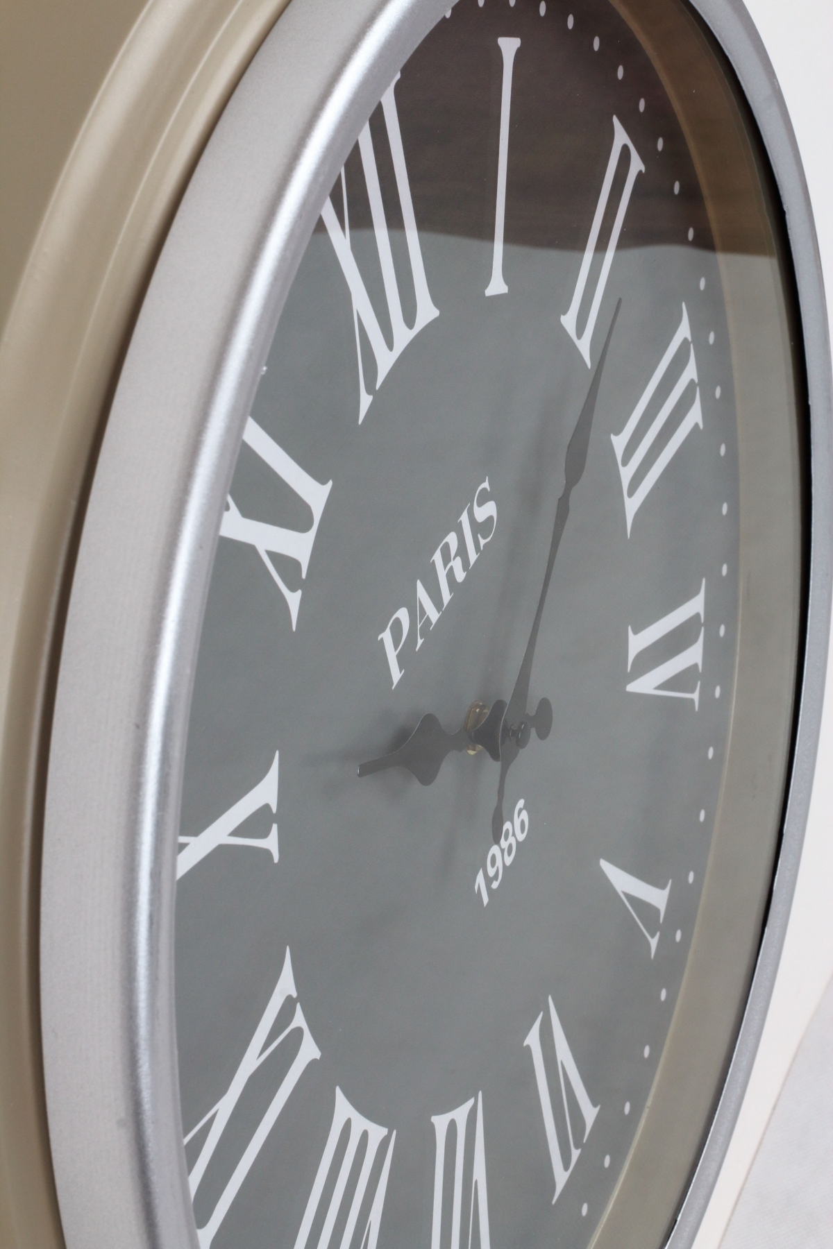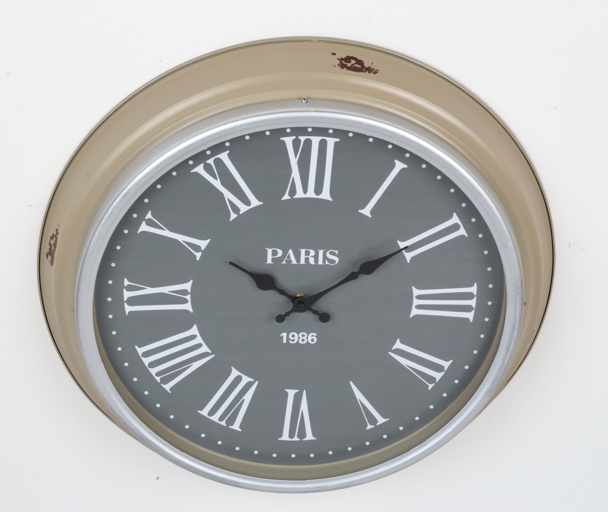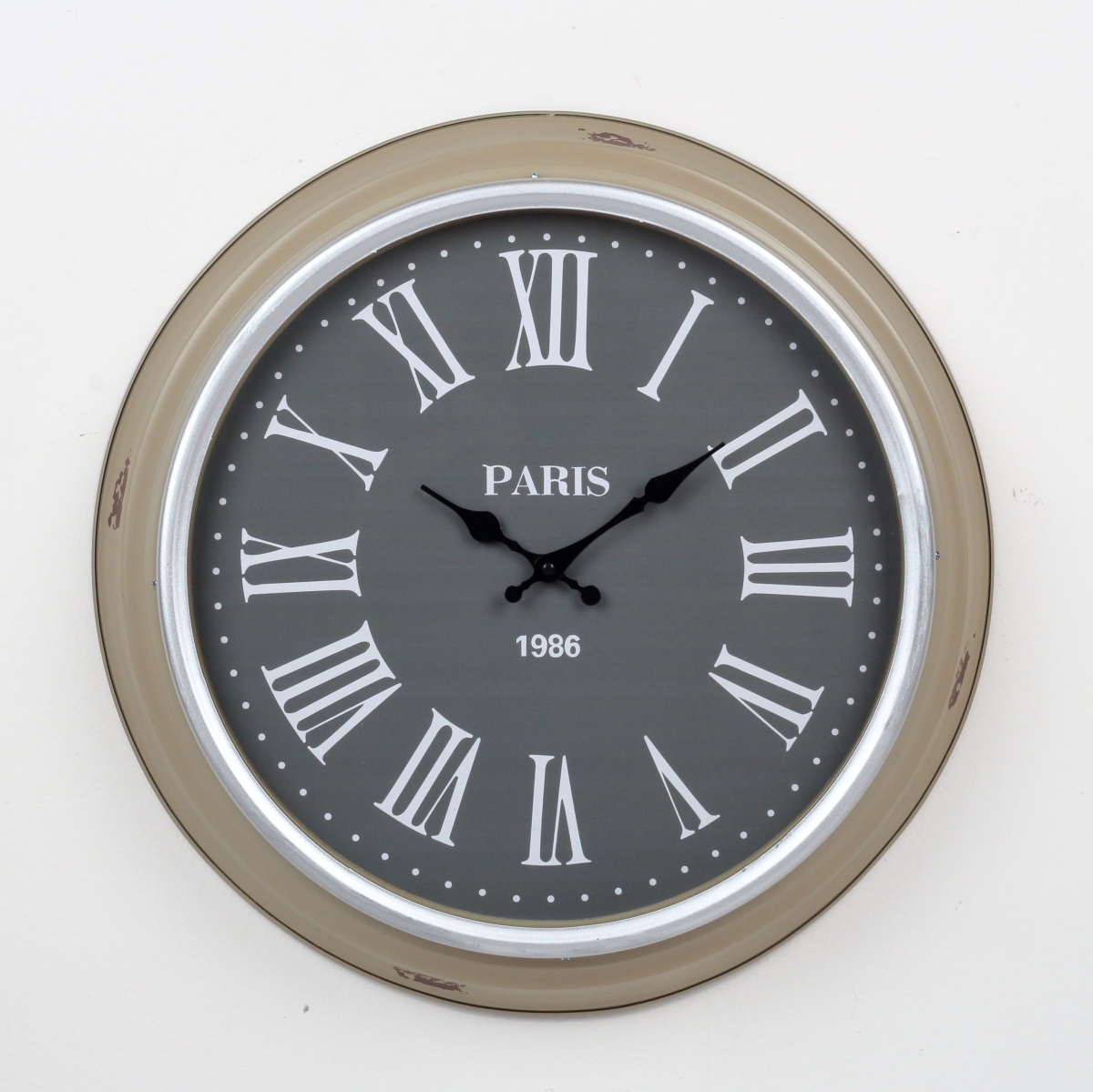 Nástěnné hodiny 50cm s velkými římskými číslicemi. Šedobílá kombinace a mírně oprýskaný vzhled oživí každý interiér.