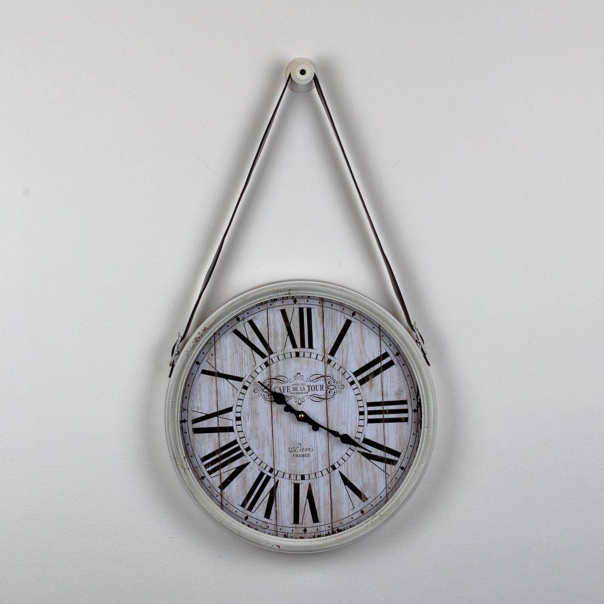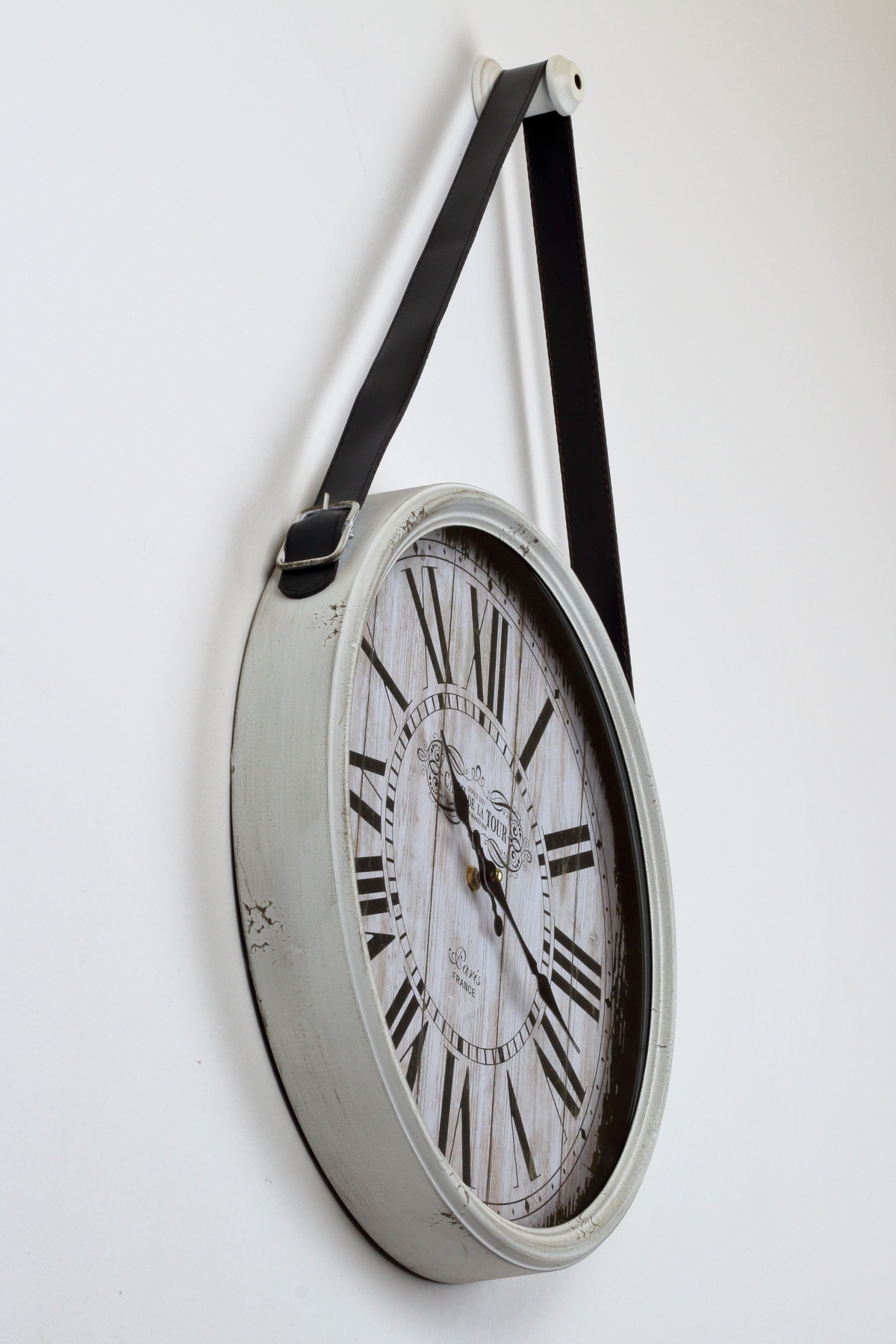 Nástěnné hodiny CAFE DE LA TOUR s popruhem 40cm mají netradiční způsob uchycení na stěnu.