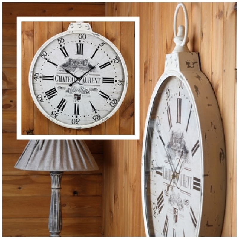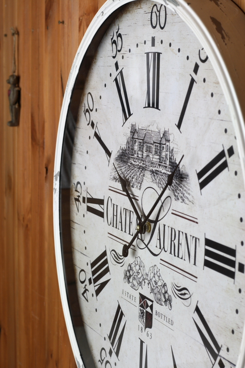 Nástěnné hodiny Chateau Laurent 60cm v luxusním bílém provedení s patinou a oprýskaným vzhledem. Hodiny vypadají jako nalezené na půdě francouzského venkovského stavení. Kombinace bílé a černé barvy je nesmrtelnou klasikou, vyniká tak kouzlo hodin. Ciferník je zdoben motivem zámku, velké římské číslice jsou doplněny ještě o malé arabské.