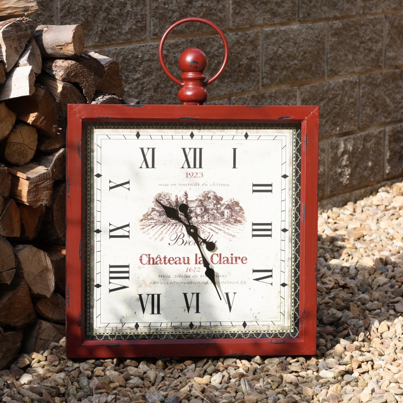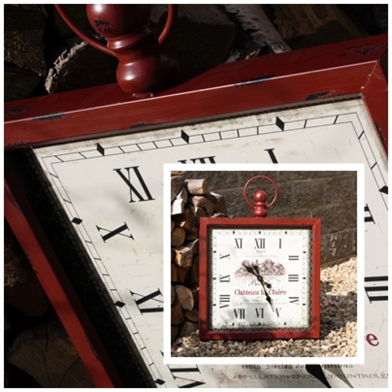 Krásný temně rudý rám působí oprýskaným dojmem, velký kovový úchyt na horní straně hodiny z nich dělá jedinečný kousek.