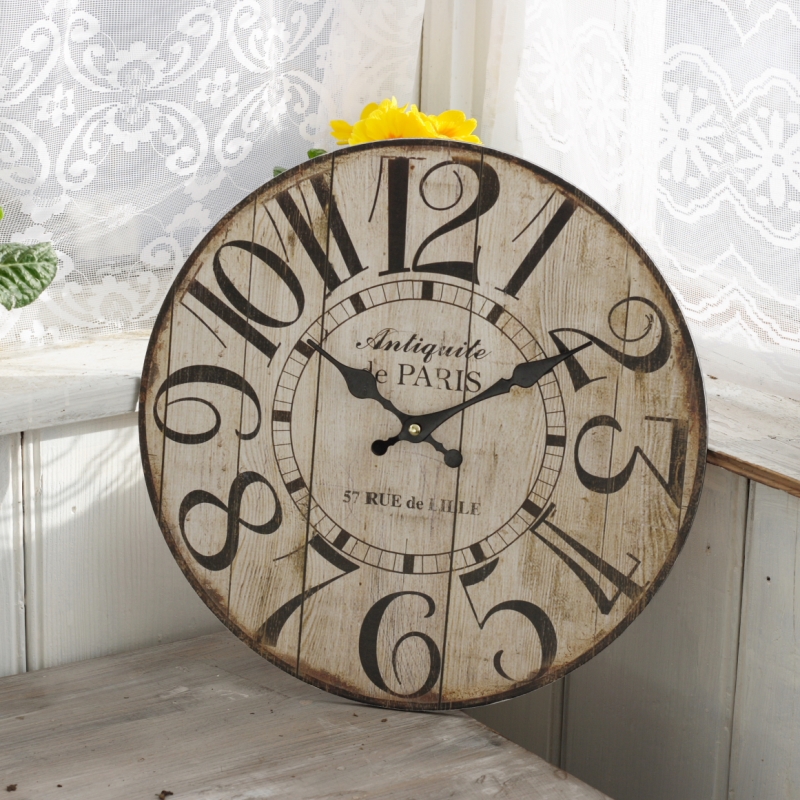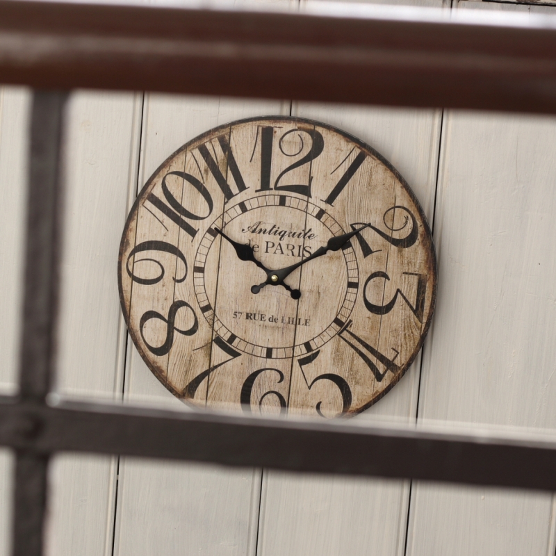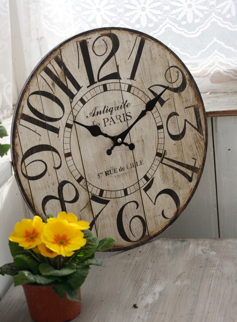 Dřevěné nástěnné hodiny Antiquite de PARIS 34cm s oprýskaným vzhledem a výraznou kresbou dřeva dělají z hodin opravdu jedinečný bytový doplněk.
